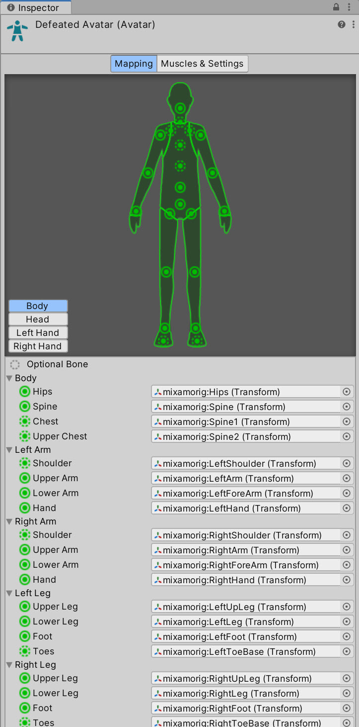 8)Humanoid 유형은 인간형 모델을 위한 애니메이션 타입입니다. 휴머노이드 모델은 일반적으로 구체적이고 동일한 기본 구조(머리, 두개의 팔, 두개의 다리로 구성)를 가지고있기때문에 리타겟팅이 가능합니다. 리타겟팅을 사용하면 유니티가 모델의 본 구조를 분석하고 아바타에 자동으로 맵핑합니다.휴머노이드 유형은 메카님 애니메이션 시스템을 사용합니다.