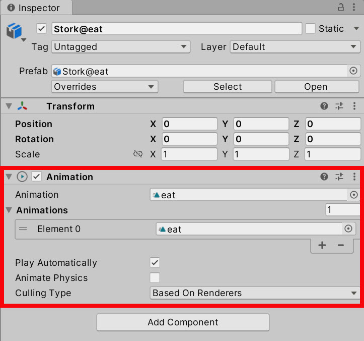5)씬에 모델을 생성하면 게임 오브젝트는 애니메이션(Animation) 컴포넌트를 포함하며 Animation에 애니메이션 클립을 할당하여 사용할수있습니다.
