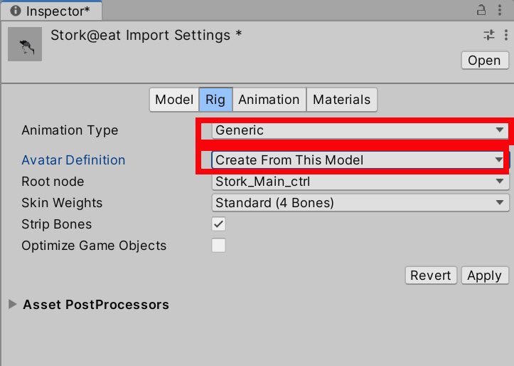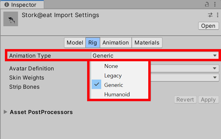 6)Generic 유형은 레거시 이후 도입된 유니티의 새로운 메카님(Mecanim) 애니메이션 시스템을 사용합니다. 비인간형 모델을 위한 애니메이션 타입으로 휴머노이드 유형이 아닌 모델(네발 달린 생물, 애니메이션 소품등)에 사용하며 골격은 임의적일 수 있으므로 리타겟팅이 불가능합니다.