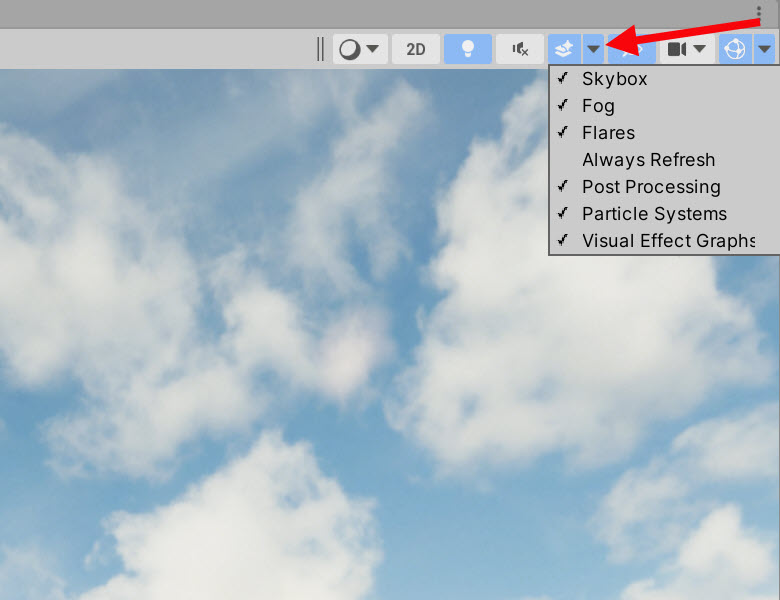 3)씬 윈도우의 상단 표시한곳을 클릭하면 always reflesh가 체크해제되어있는것을 확인할수있습니다.