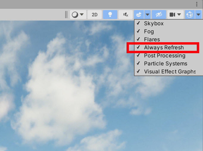 일반적으로 이펙트의 애니메이션는 런타임에서 확인할수있습니다. always reflesh를 사용하여 시간을 기반으로하는 효과 애니메이션(쉐이더, 터레인의 잔디, 나무, 기타) 을 씬에서 항상 표시할수있습니다.