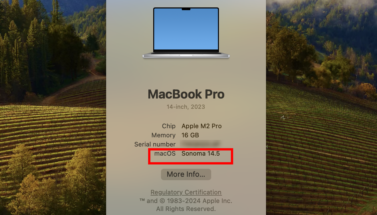 2)설치된 macOS를 확인합니다. 현재 Sonoma 14.5가 설치되어있는것을 확인할수있습니다.