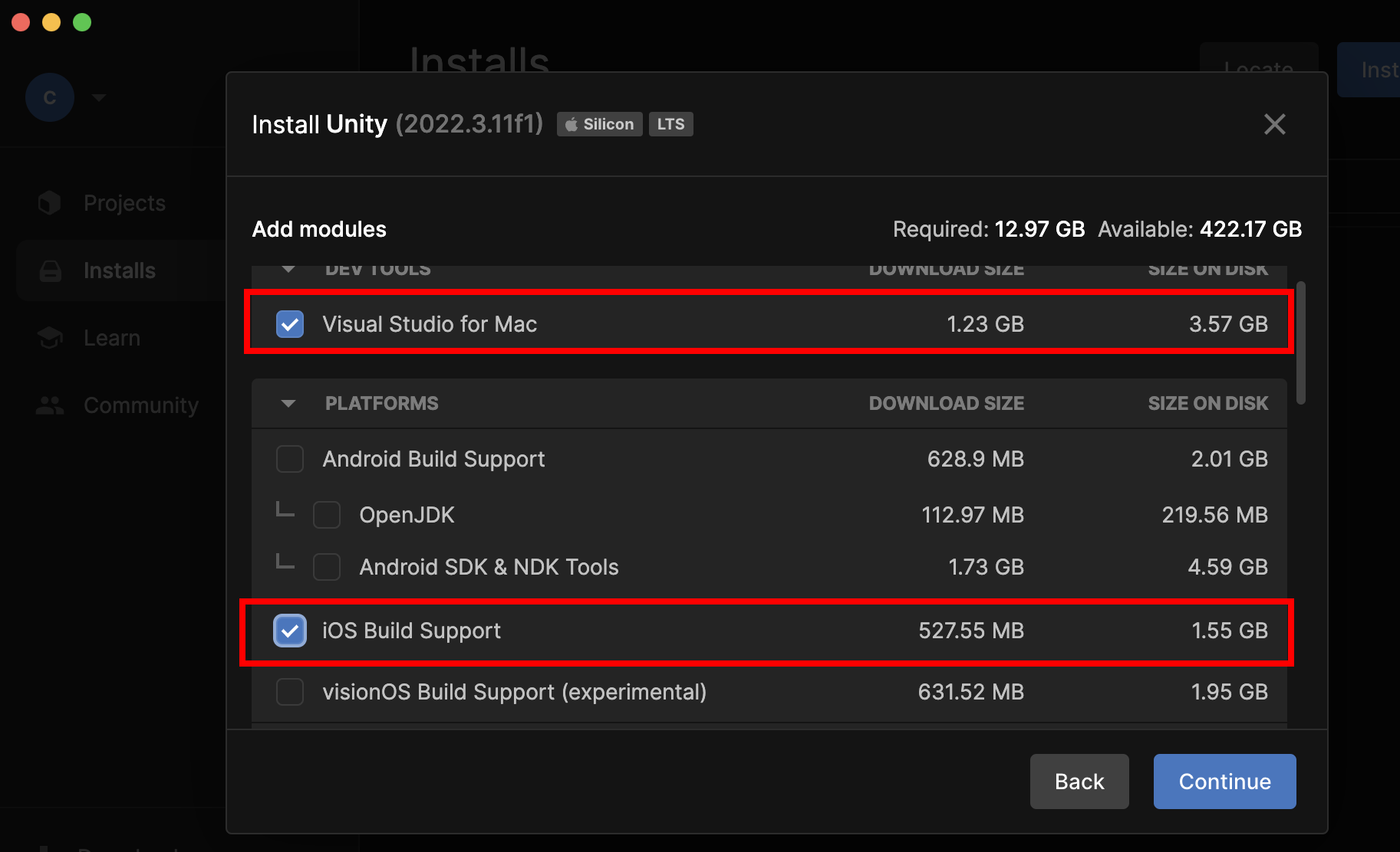 9)추가 모듈(module)을 선택하고 설치를 진행합니다. 프로젝트를 iOS 빌드하는 경우 iOS Build Support에 체크합니다.