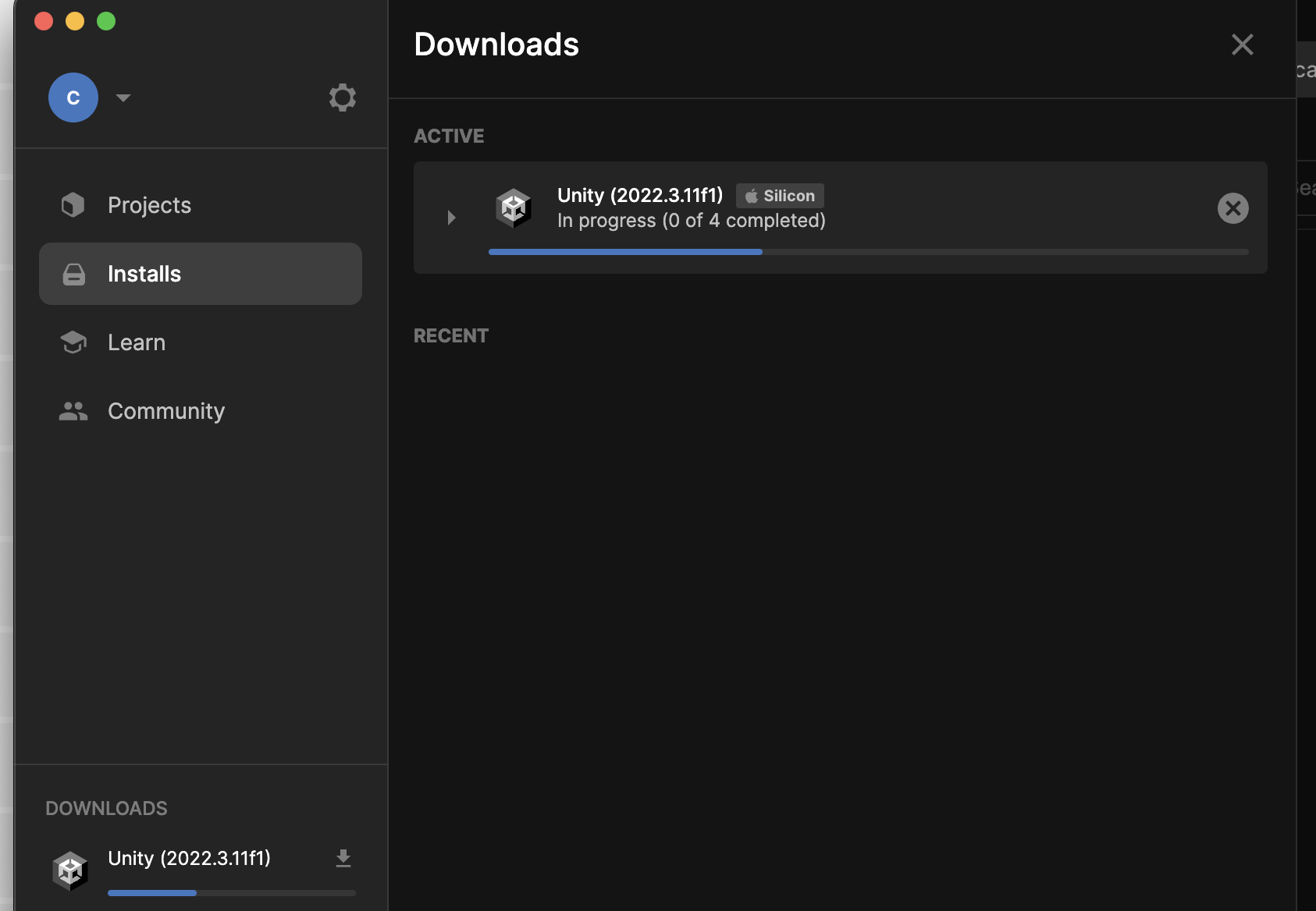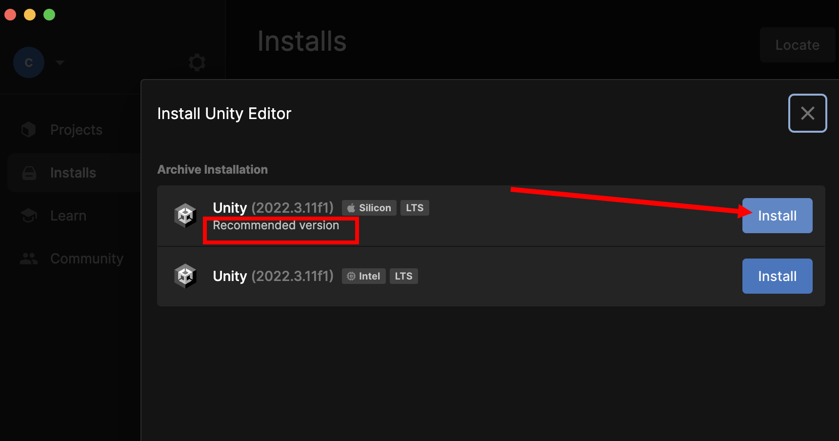 6)유니티 허브에서 에디터 설치를 시작합니다. 맥(mac)이 애플 실리콘(Silicon)을 사용하는 경우 Silicon을 선택합니다.