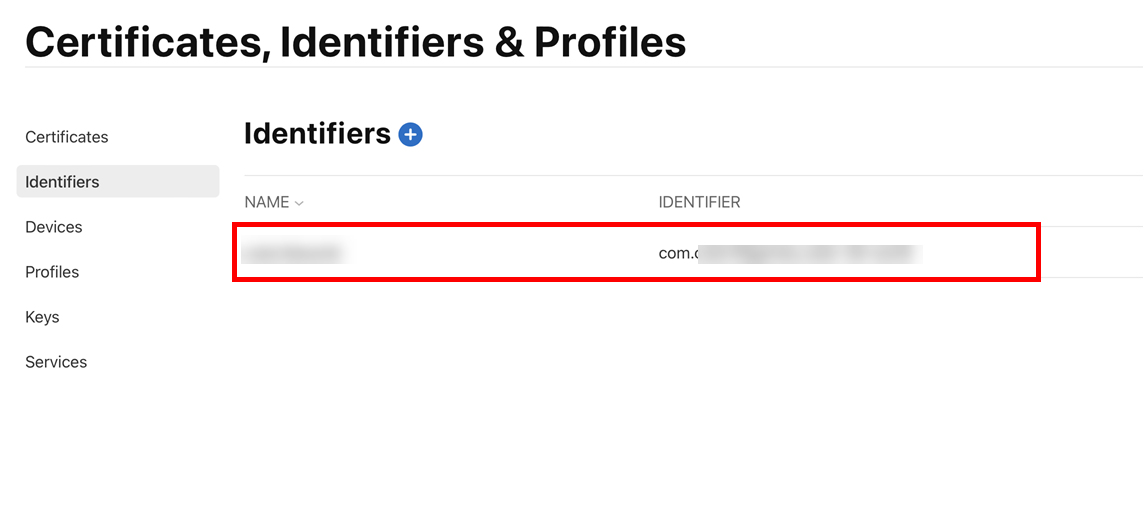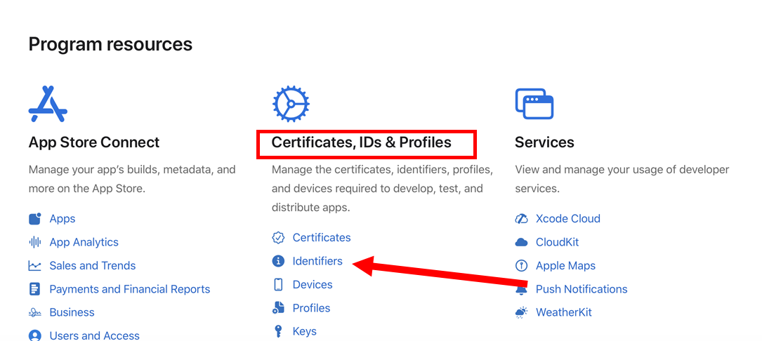 프로그램 리소스(Program resources)에서 인증서, ID 및 프로파일(Certificates, IDs & Profiles)의 식별자(Identifiers)를 선택합니다.