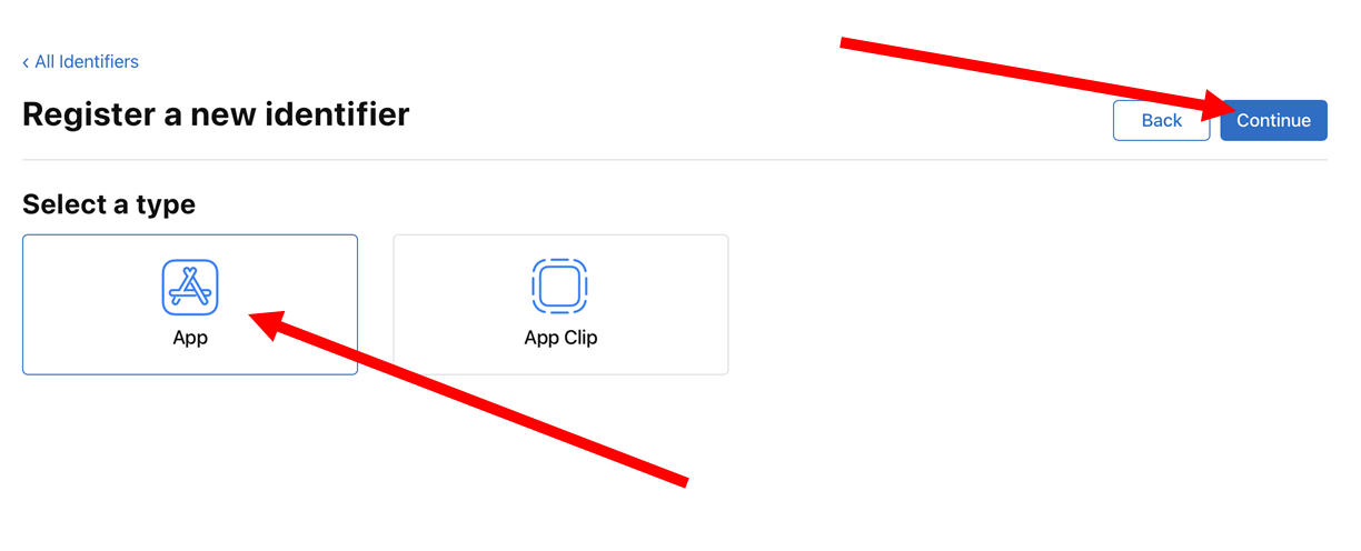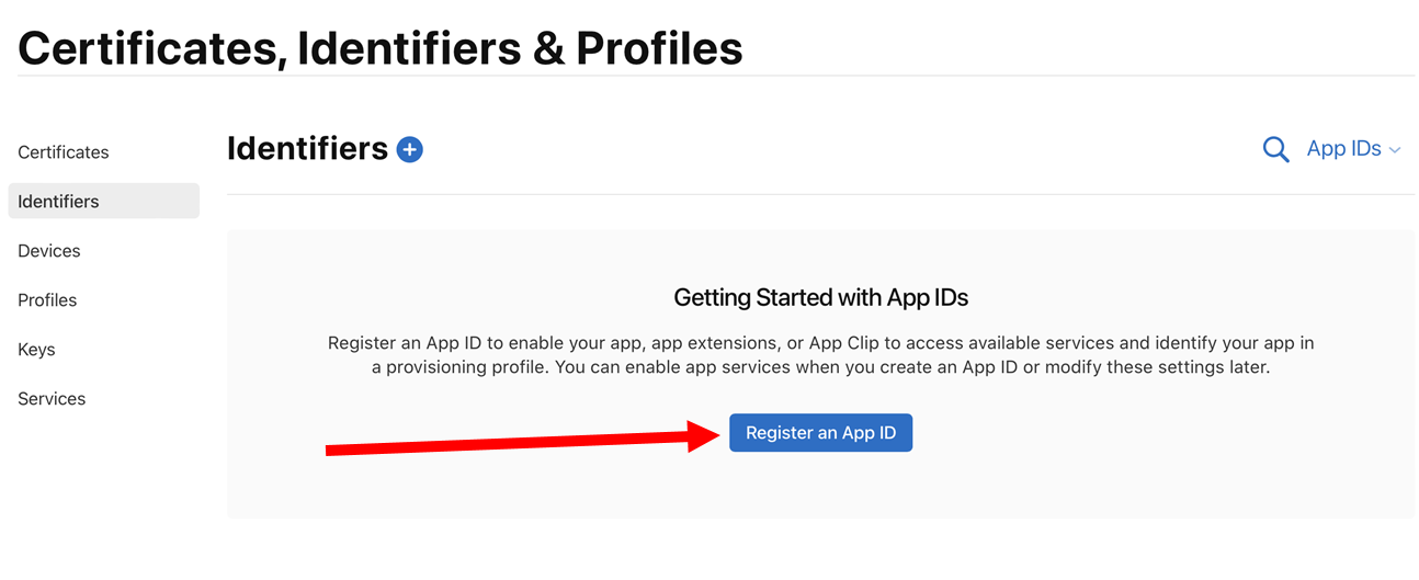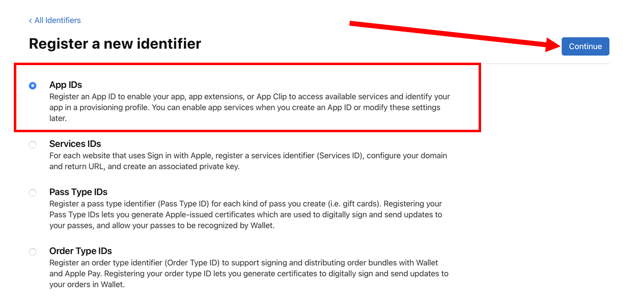2)register an App ID를 선택합니다. 앱 ID를 등록하여 앱이 사용 가능한 서비스에 액세스하고 프로비저닝 프로필에서 앱을 식별할 수 있도록 합니다.