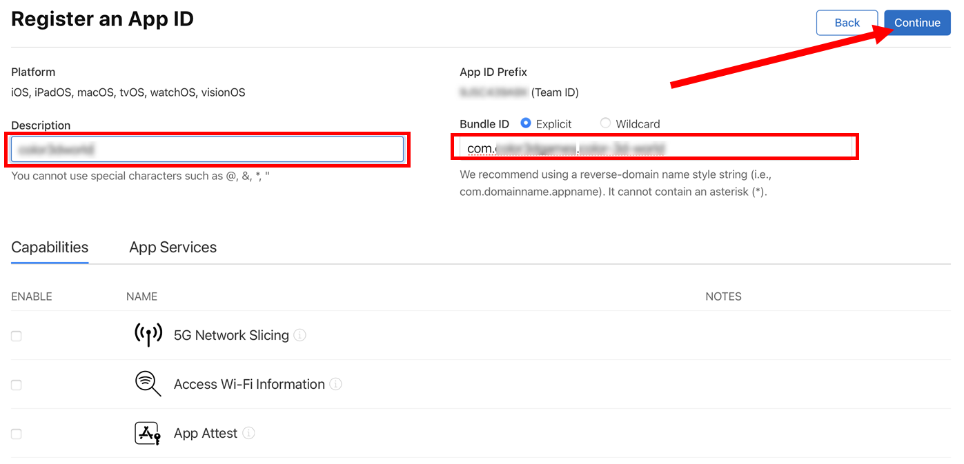 5)앱 설명(description)과 번들 ID(Bundle ID)를 입력합니다.