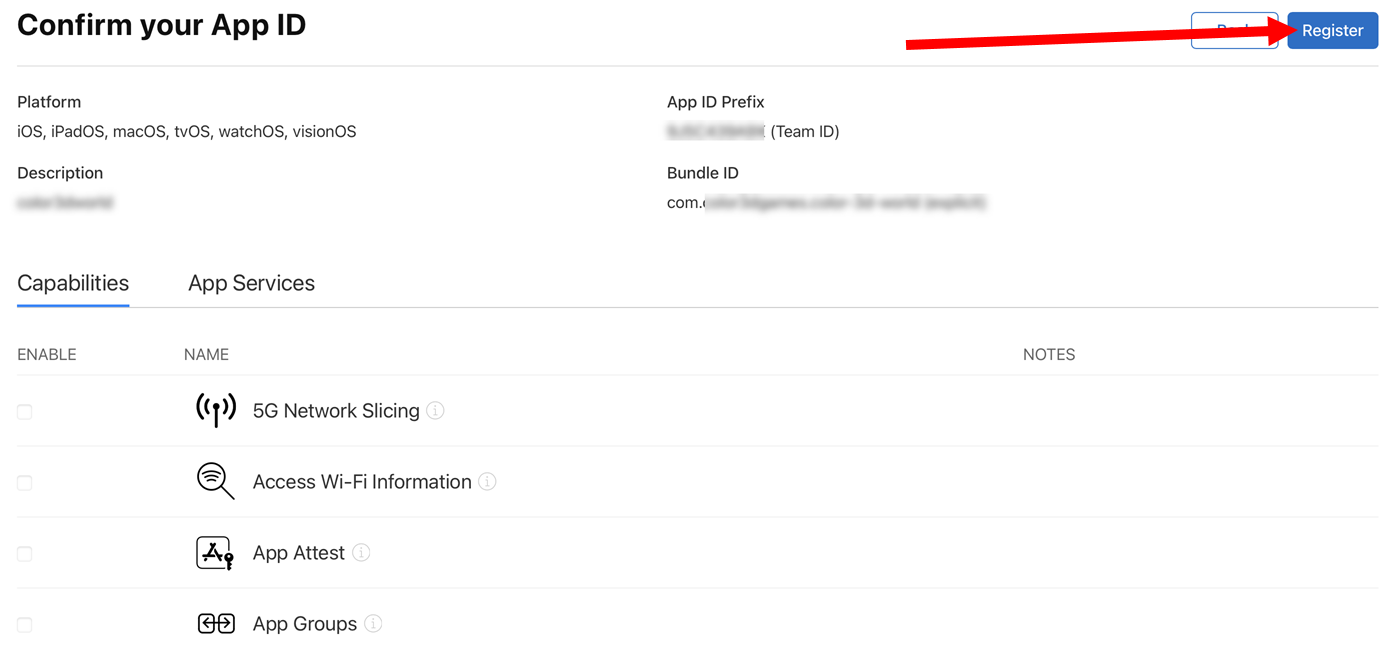 6)앱 ID를 확인하고 등록합니다(Register)