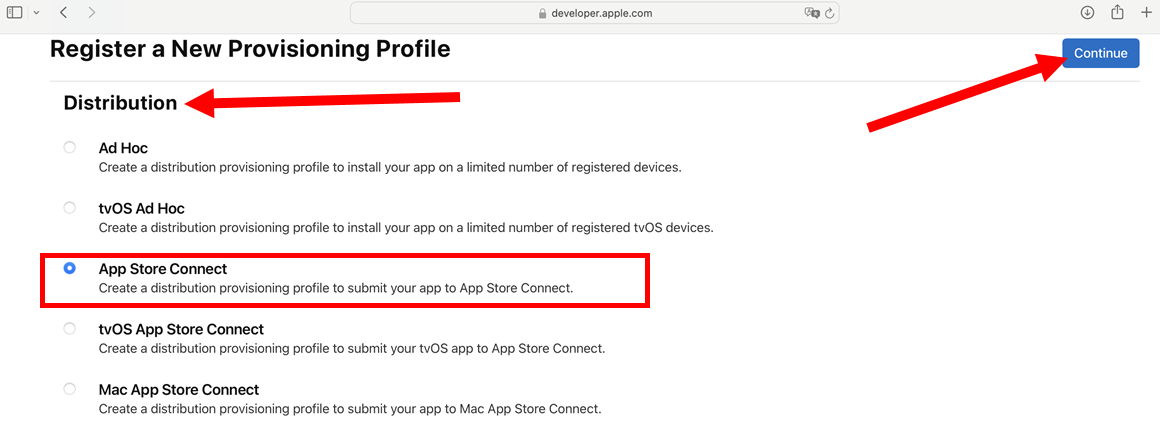 3)앱스토어 커넥트(app store connect)에 앱을 제출하고 배포하려면 Distribution의 App Store Connect를 선택합니다.