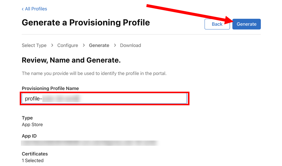 6)프로파일 이름(provisioning profiles name)을 설정하고 generate를 클릭하면 프로파일을 생성합니다.