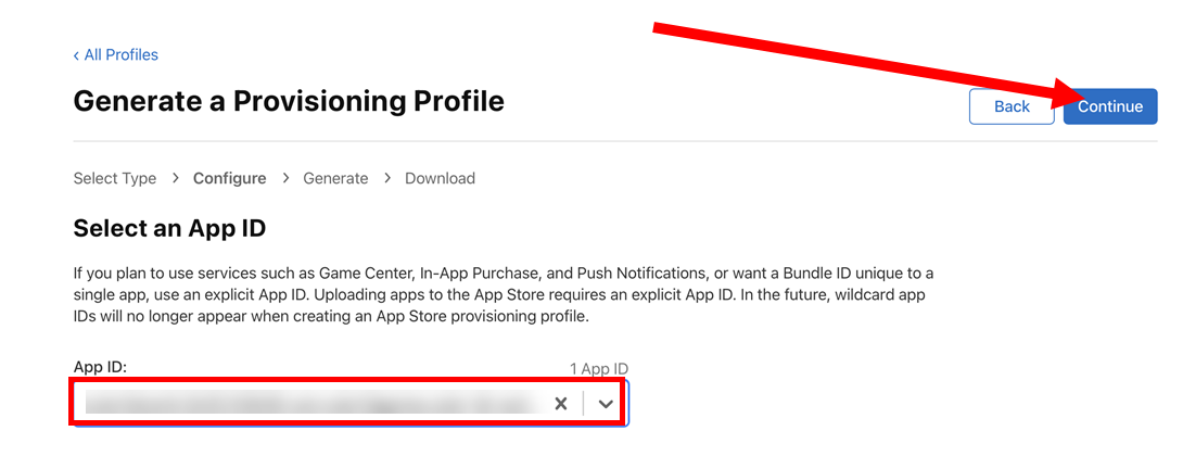 4)앱 ID(App ID)를 선택합니다. 이전에 등록한 앱 ID가 표시됩니다.