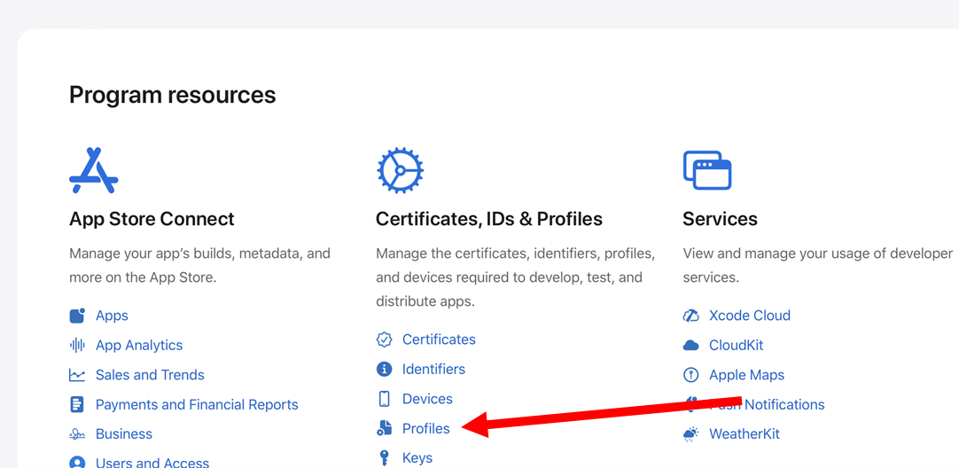 1)애플 개발자(Apple Developer) 사이트에서 계정 로그인하고 Account 페이지에서 인증서, ID 및 프로파일(Certificates, IDs & Profiles)의 프로파일(Profiles)를 선택합니다.