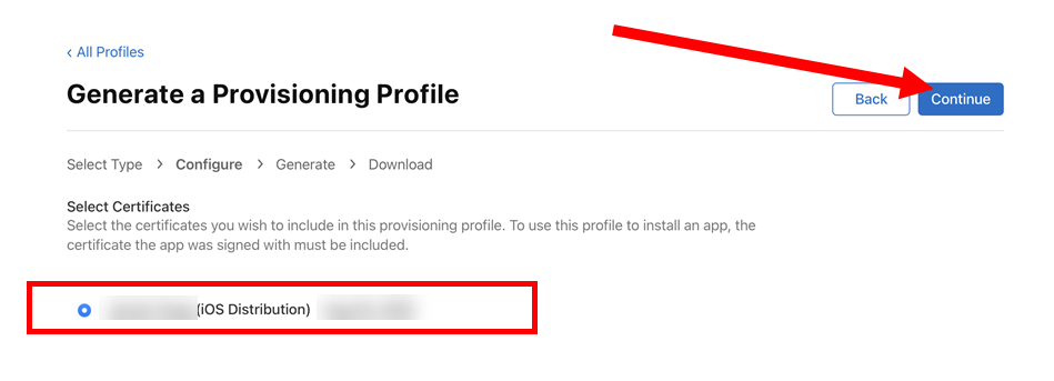 5)프로파일에 포함시킬 인증서(Certificates)를 선택합니다. 이전에 생성한 인증서가 표시됩니다.