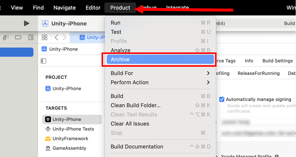 1)Xcode 상단의 product 메뉴에서 archive를 선택합니다.
