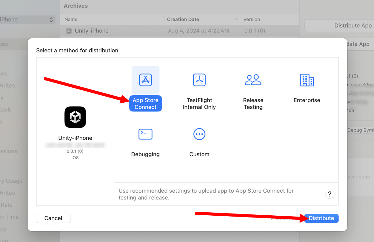 5)배포 방법을 선택합니다. App Store Connect를 통해 iOS 앱을 배포하려면 App Store Connect를 선택합니다. 앱스토어 커넥트(App Store Connect)는 Apple이 제공하는 개발자 포털로 앱을 App Store에 제출하고 관리할 수 있는 플랫폼입니다. distribute를 클릭하면 업로드 절차를 진행합니다.