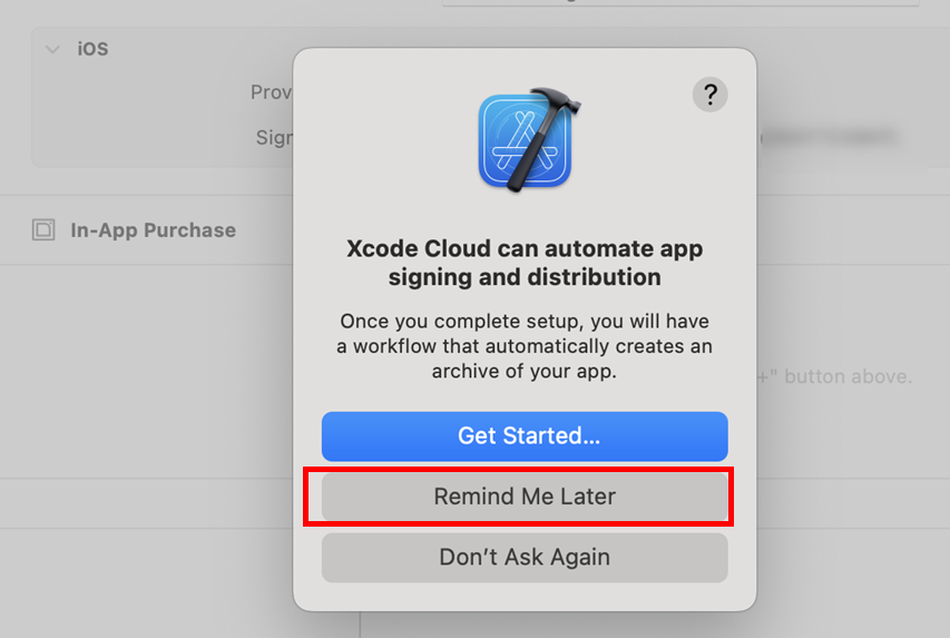 2)Xcode Cloud 사용 여부를 선택합니다. Xcode Cloud 사용없이 진행하려면 remind me later를 선택합니다.