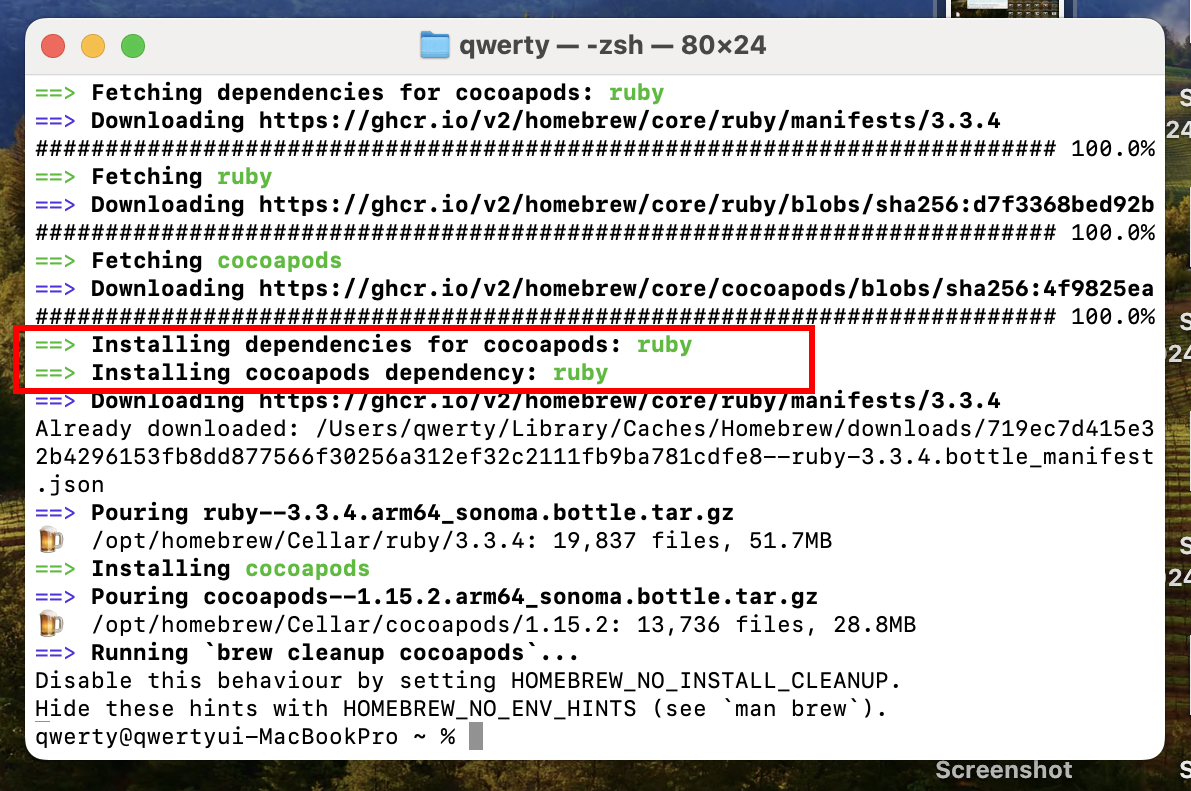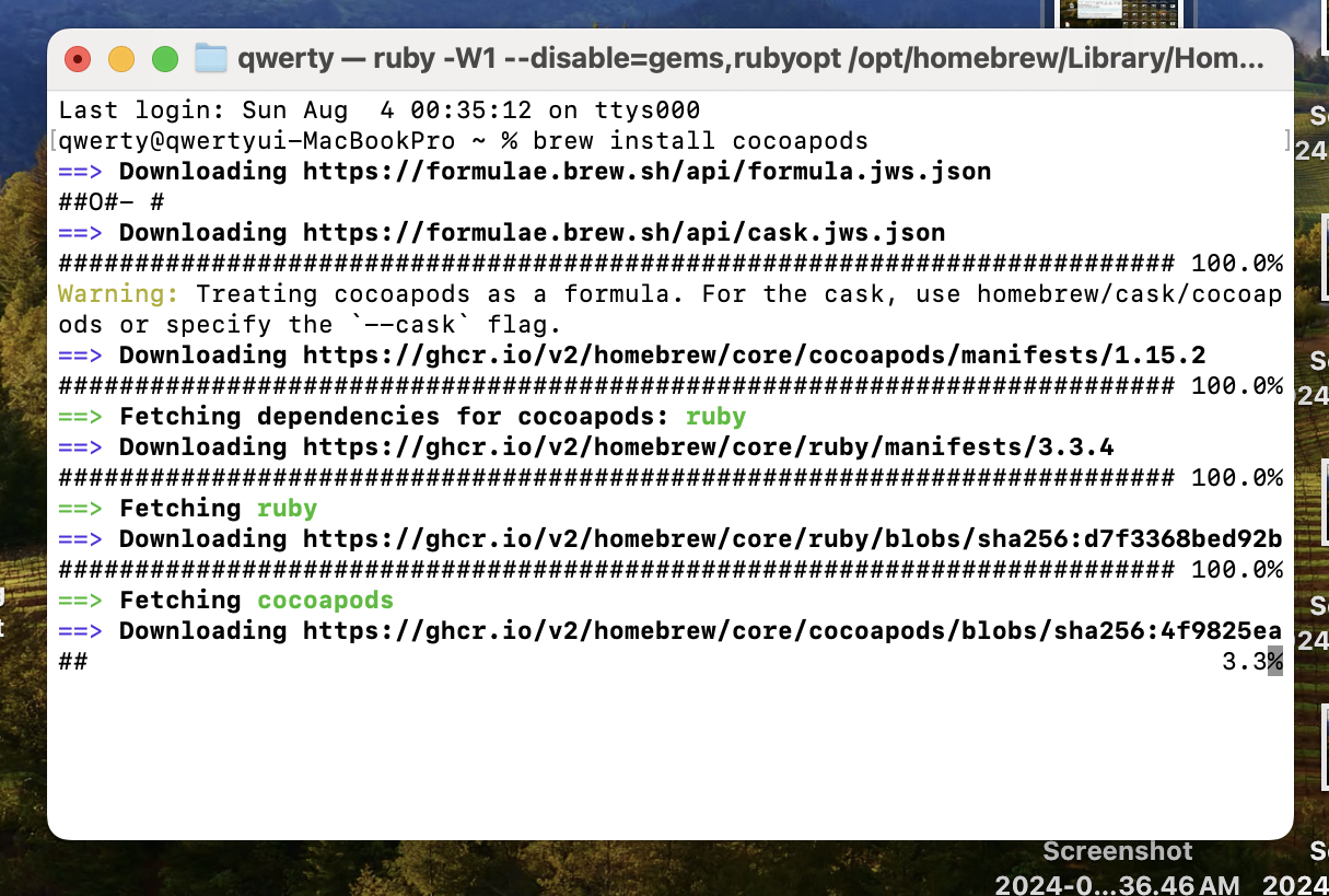 정상적으로 ruby 및 Cocoapods 설치를 진행하는것을 확인할수있습니다.