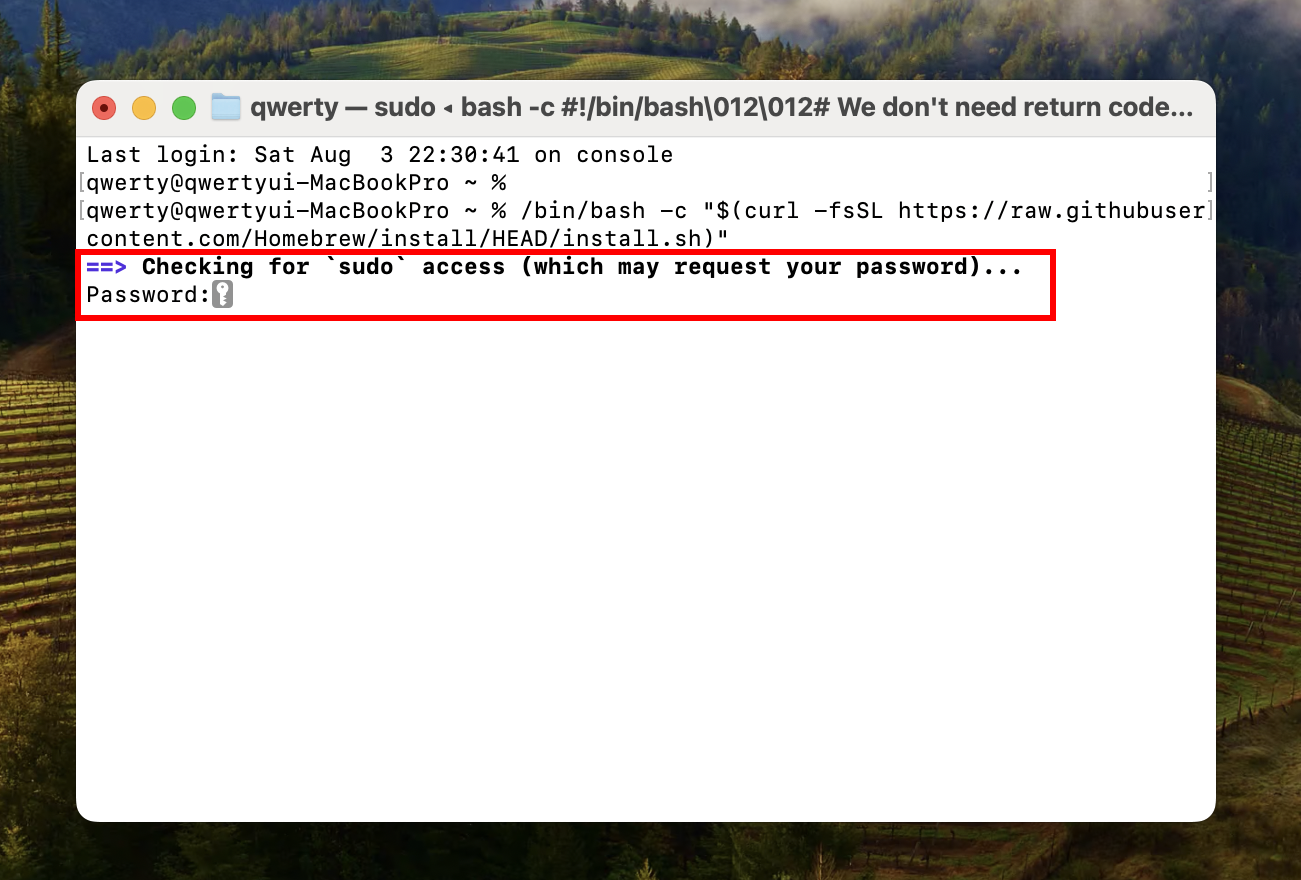 3)mac 사용자 계정의 비밀번호를 입력하면 Homebrew 다운로드 및 설치를 시작합니다.