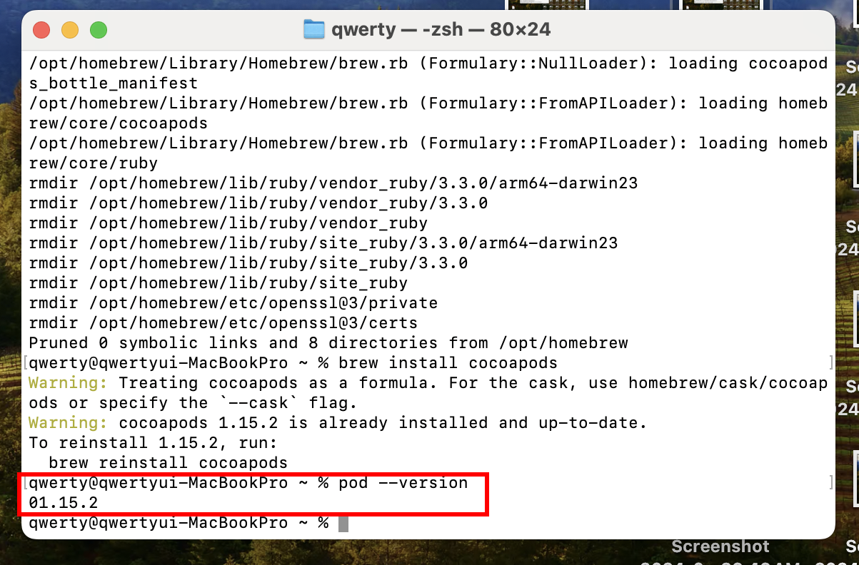 6)코코아팟 설치를 완료하면 다음을 입력하여 설치한 CocoaPods의 버전을 확인합니다
