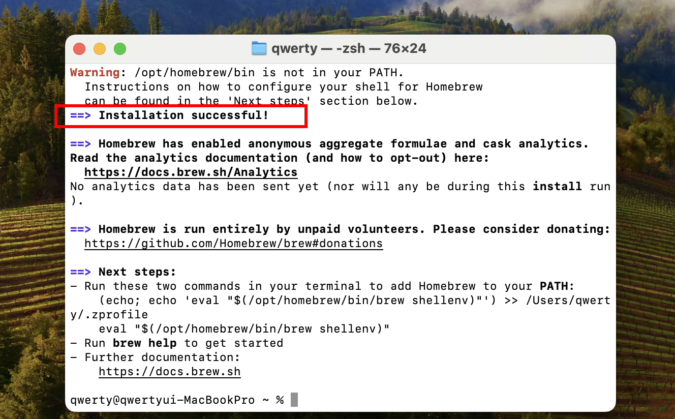 4)Homebrew 설치를 정상적으로 완료한것을 확인할수있습니다.