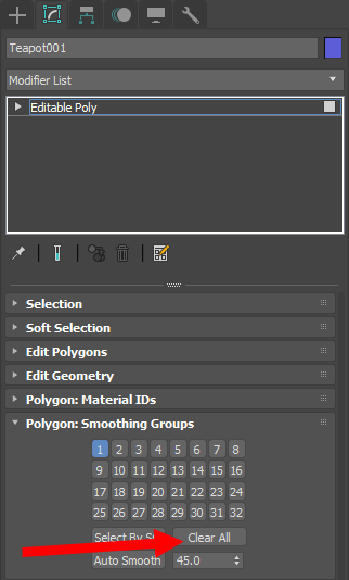 2)전체 폴리곤을 선택하고 Smoothing Groups의 Clear All을 선택합니다.