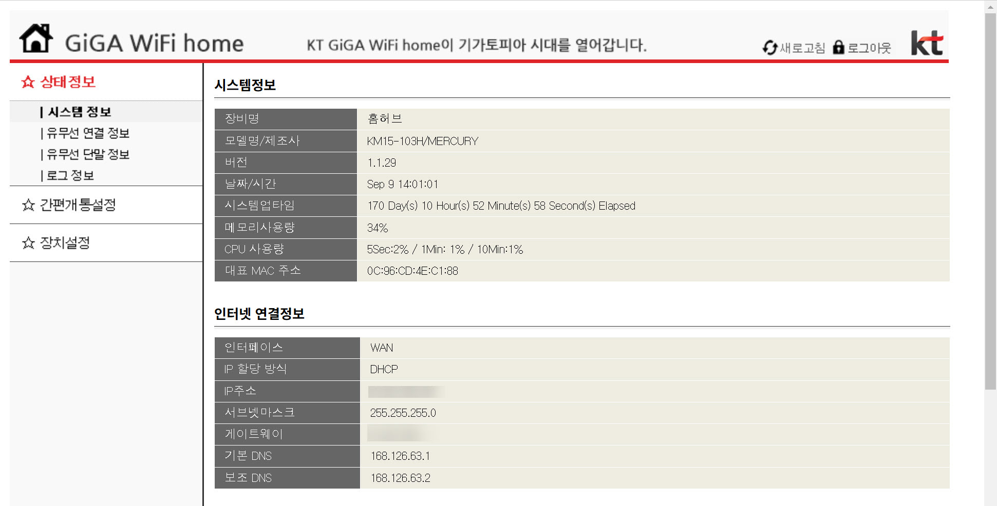 10)공유기 설정 페이지에 정상적으로 로그인한것을 확인할수있습니다.