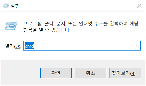 1)실행에서 cmd를 입력하여 명령 프롬프트를 열기합니다.