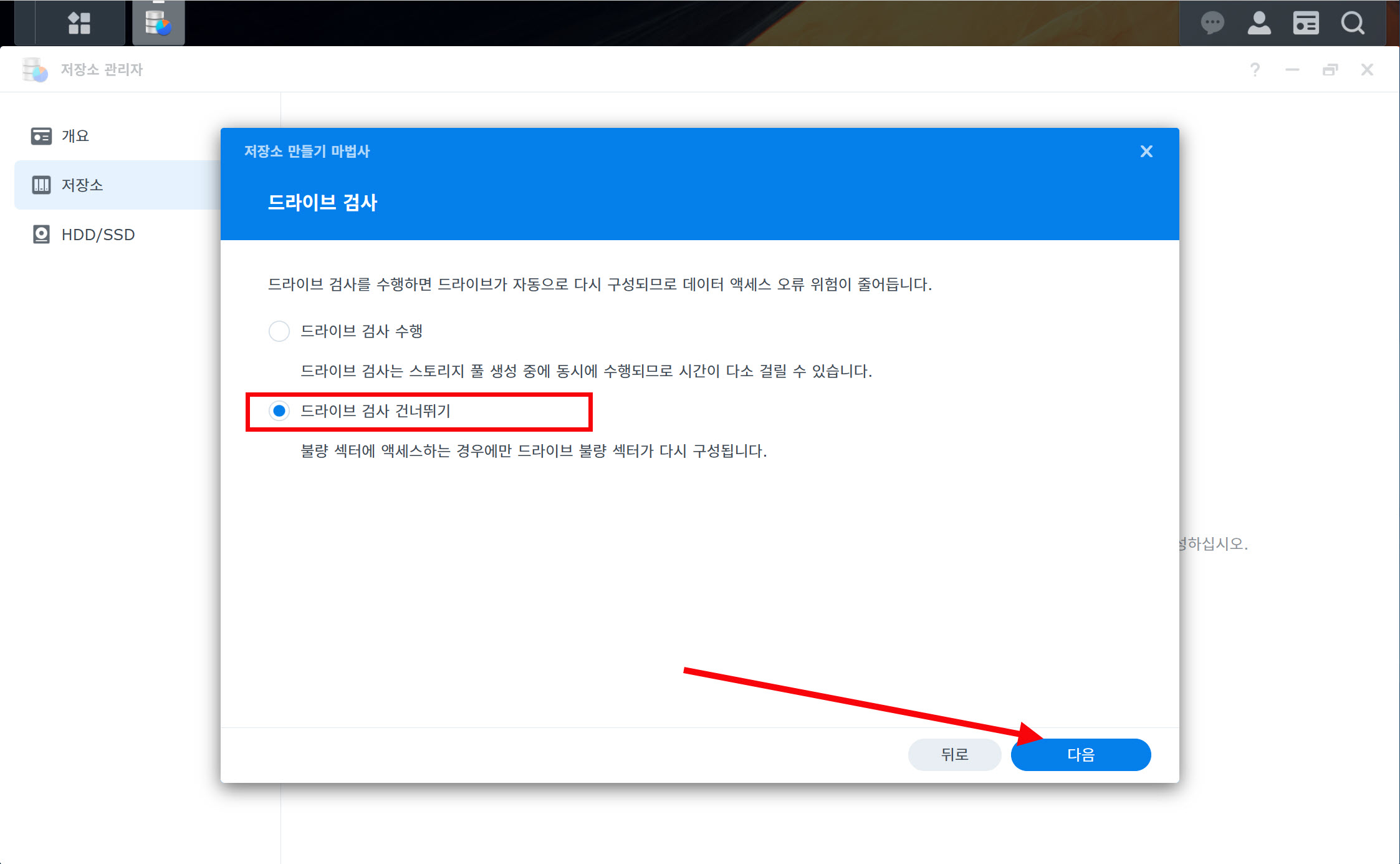 13)드라이브 검사를 수행 또는 건너뛰기하고 다음으로 이동합니다.
