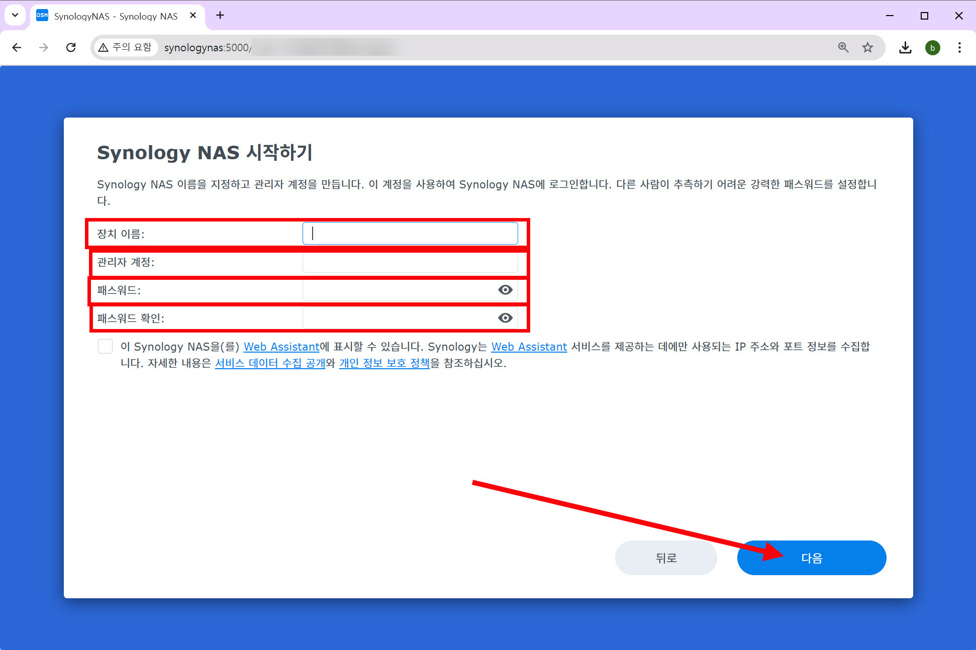 5)장치 이름, 관리자 계정, 패스워드를 설정합니다.