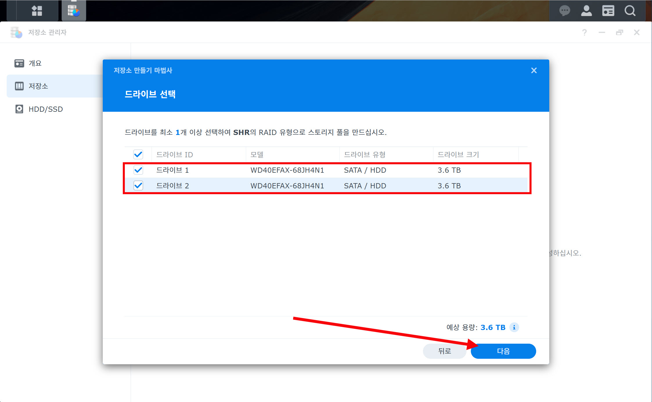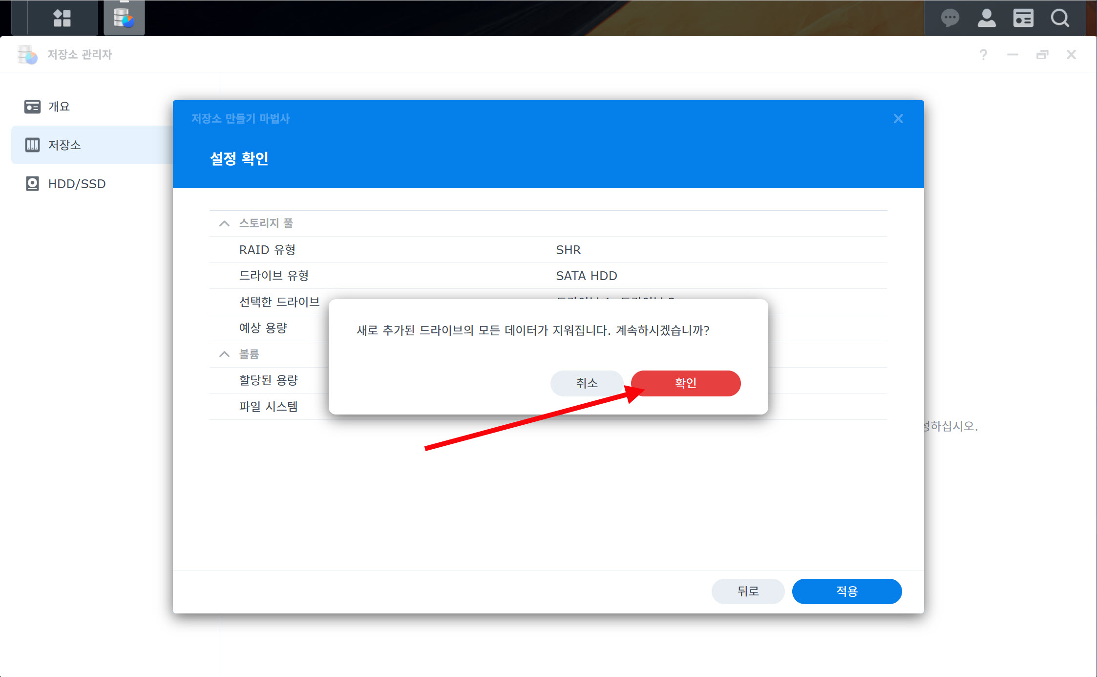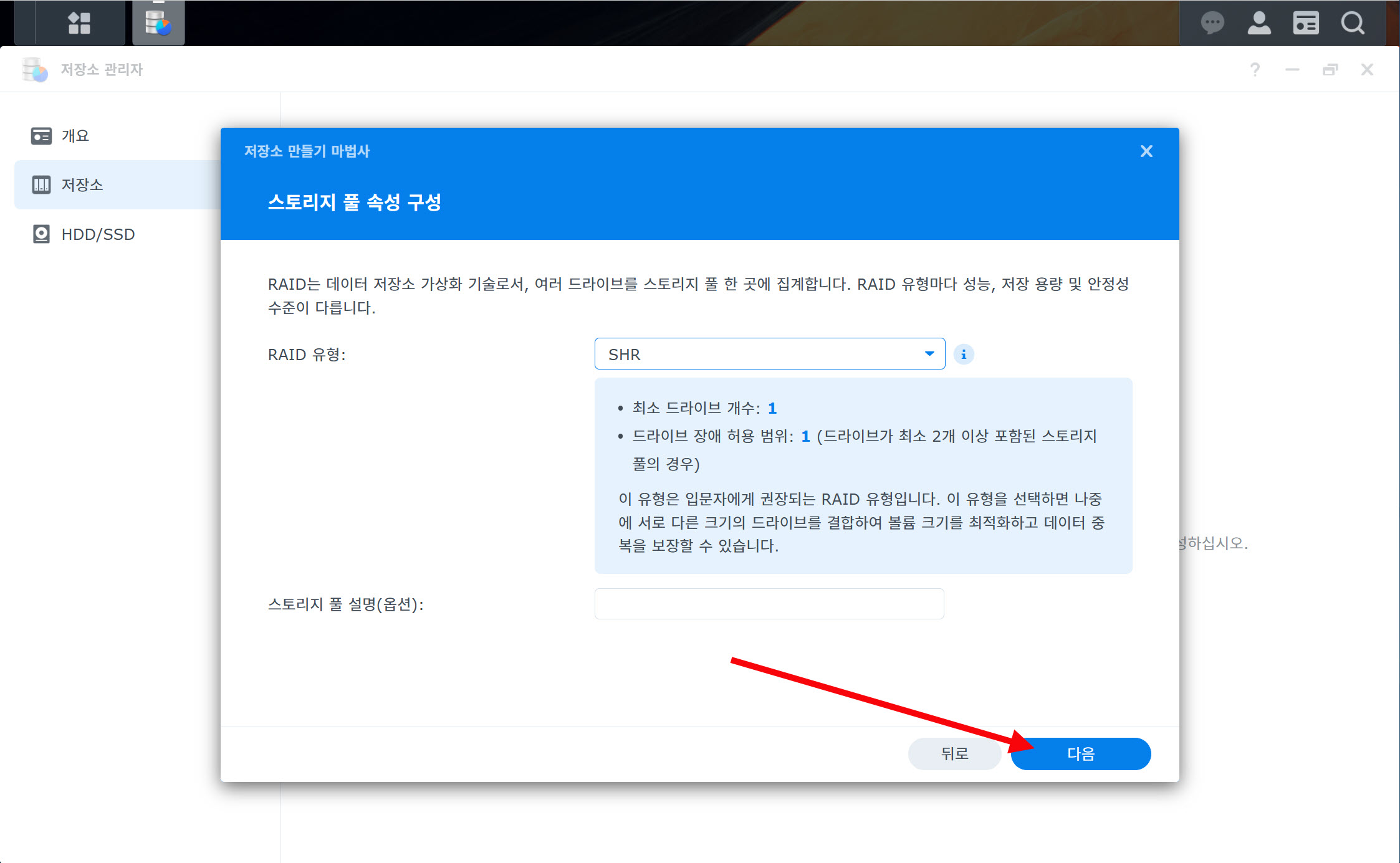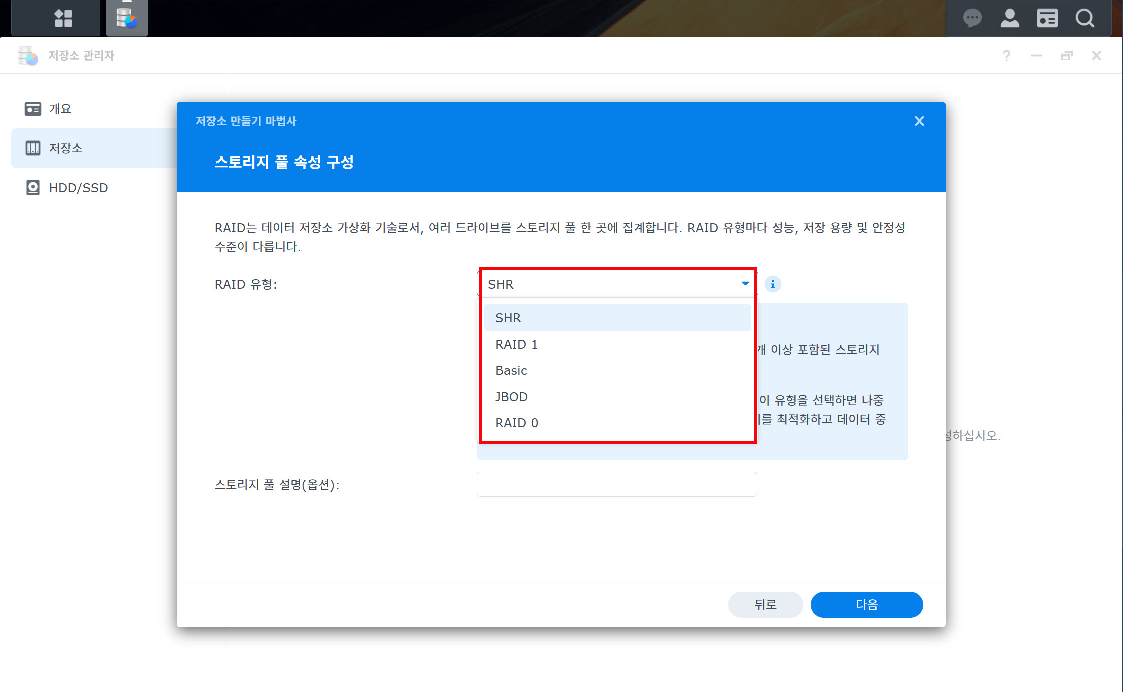 11)예에서 SHR을 선택하였습니다(입문자 권장 RAID 유형)