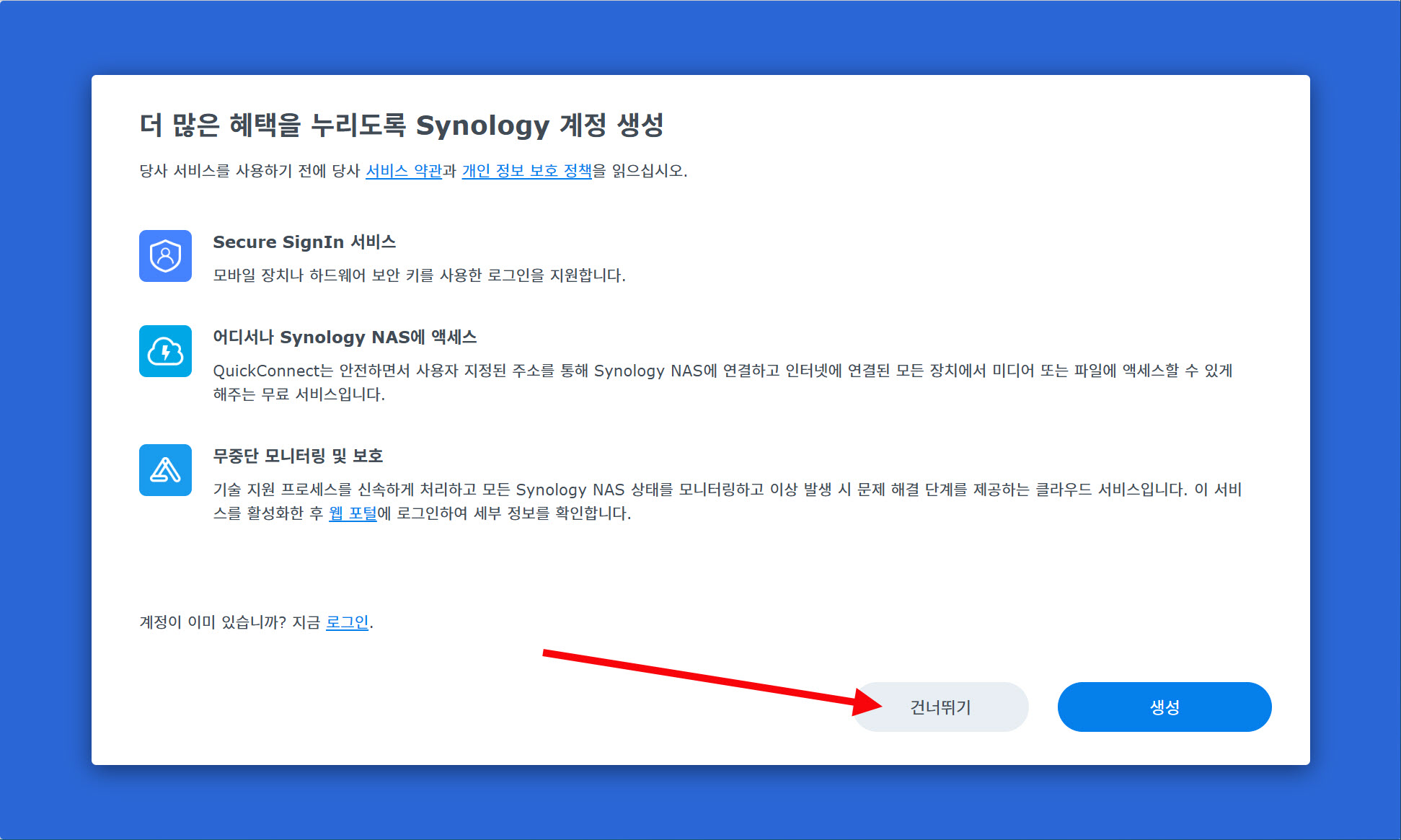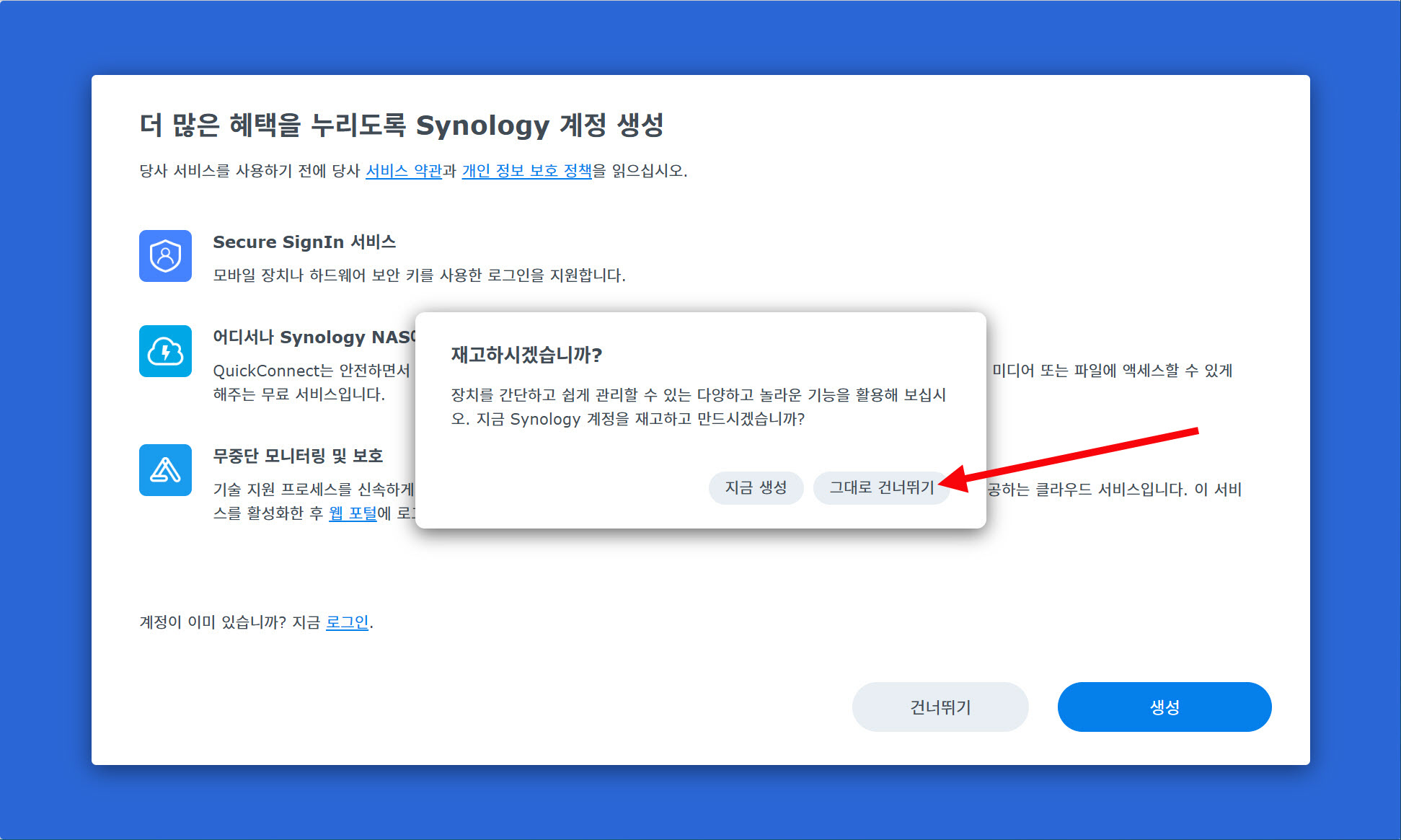 7)시놀로지에서 제공하는 기타 서비스를 사용할수있습니다. 서비스 사용을 나중에 설정하려면 건너뛰기를 선택합니다.
