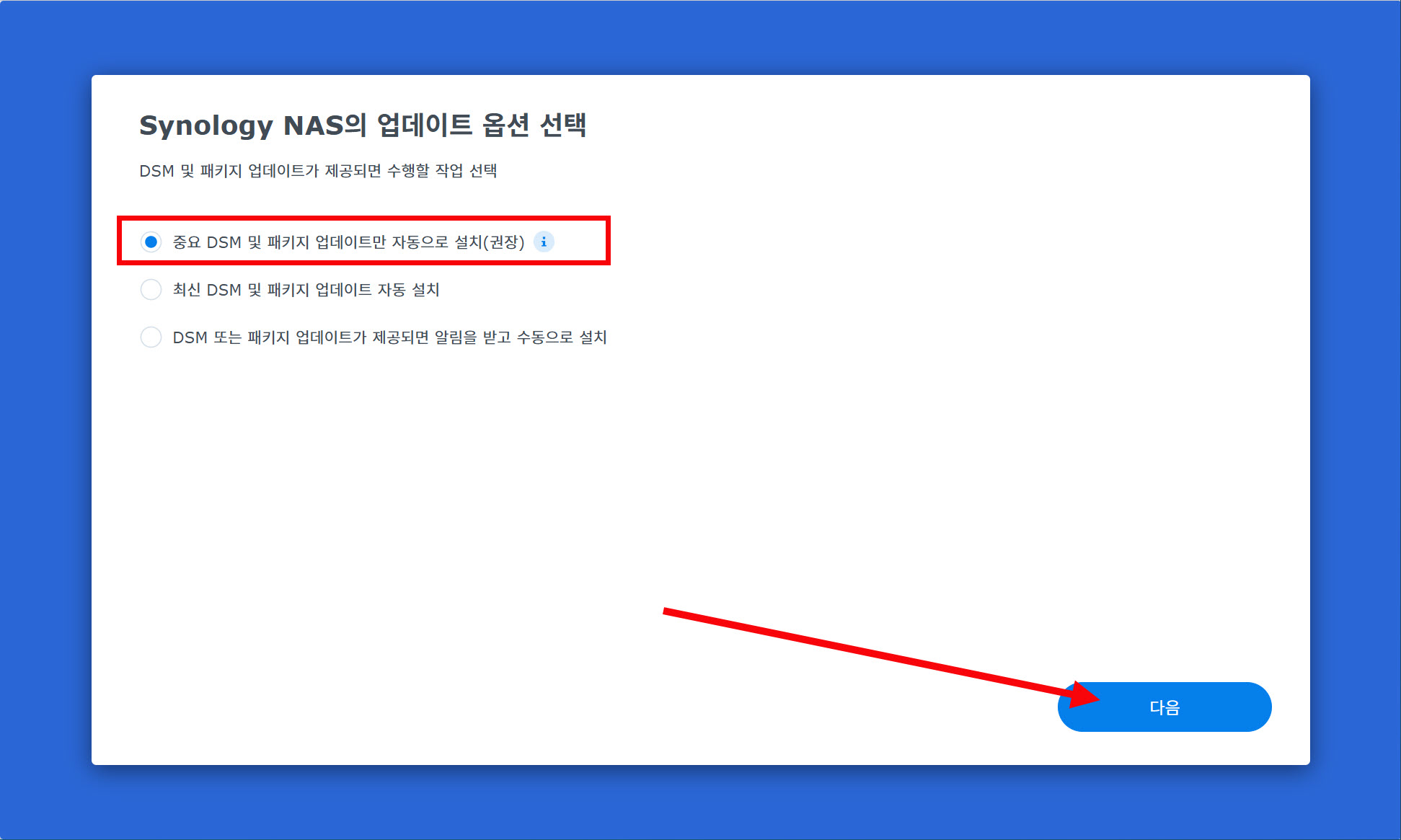 6)DSM 및 패키지 업데이트 옵션을 선택하고 다음으로 이동합니다.