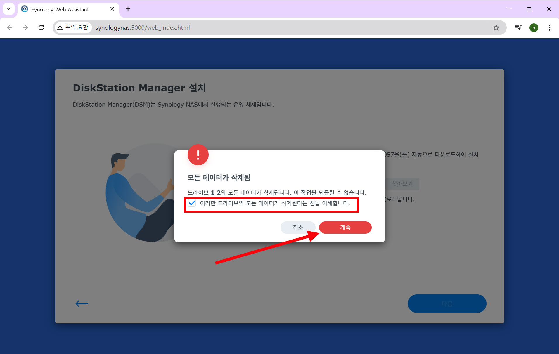 3)DSM 설치를 시작하면 NAS에 있는 드라이브의 모든 데이터가 삭제됩니다(시스템 파티션 포맷) 확인하고 계속을 클릭합니다.