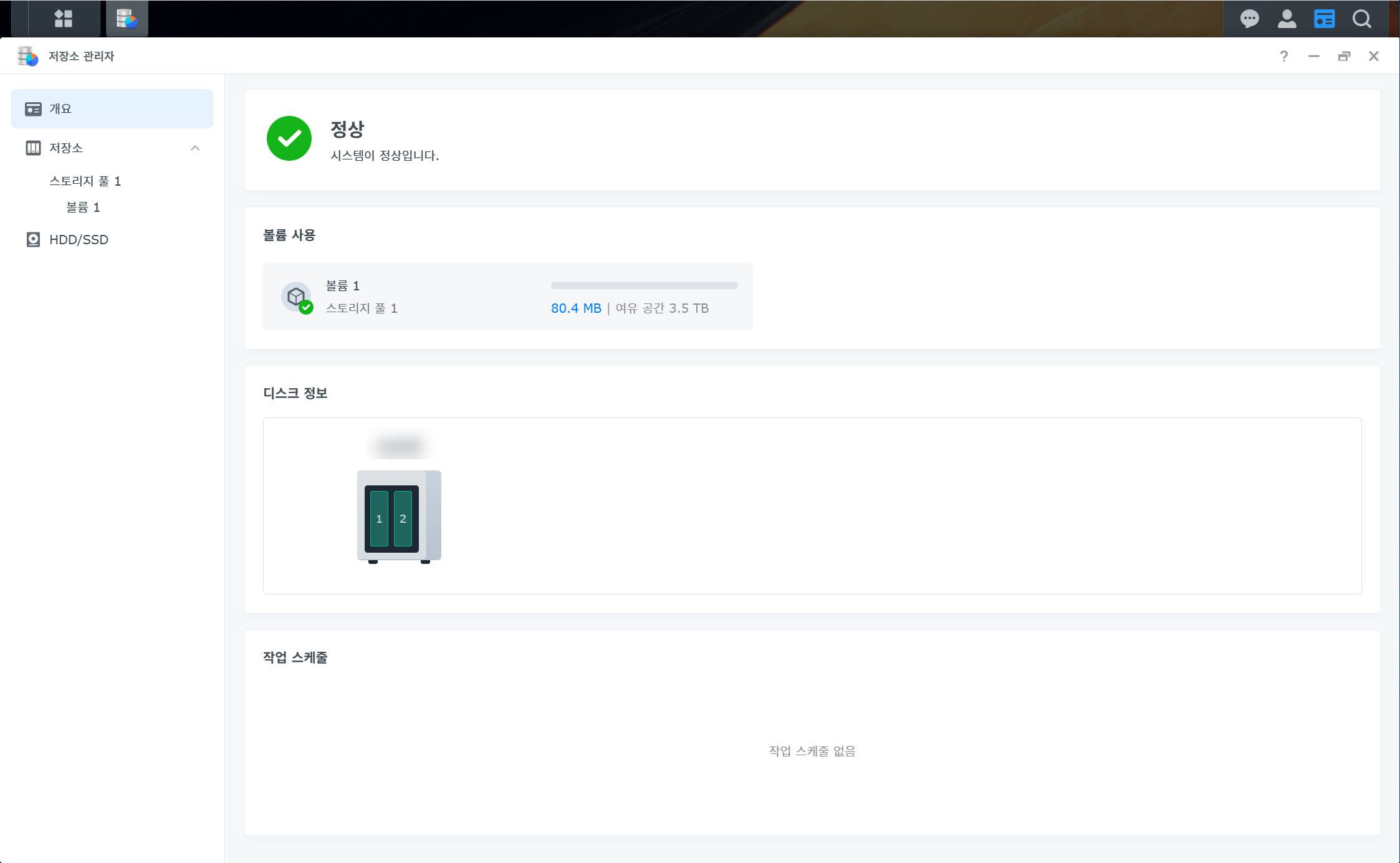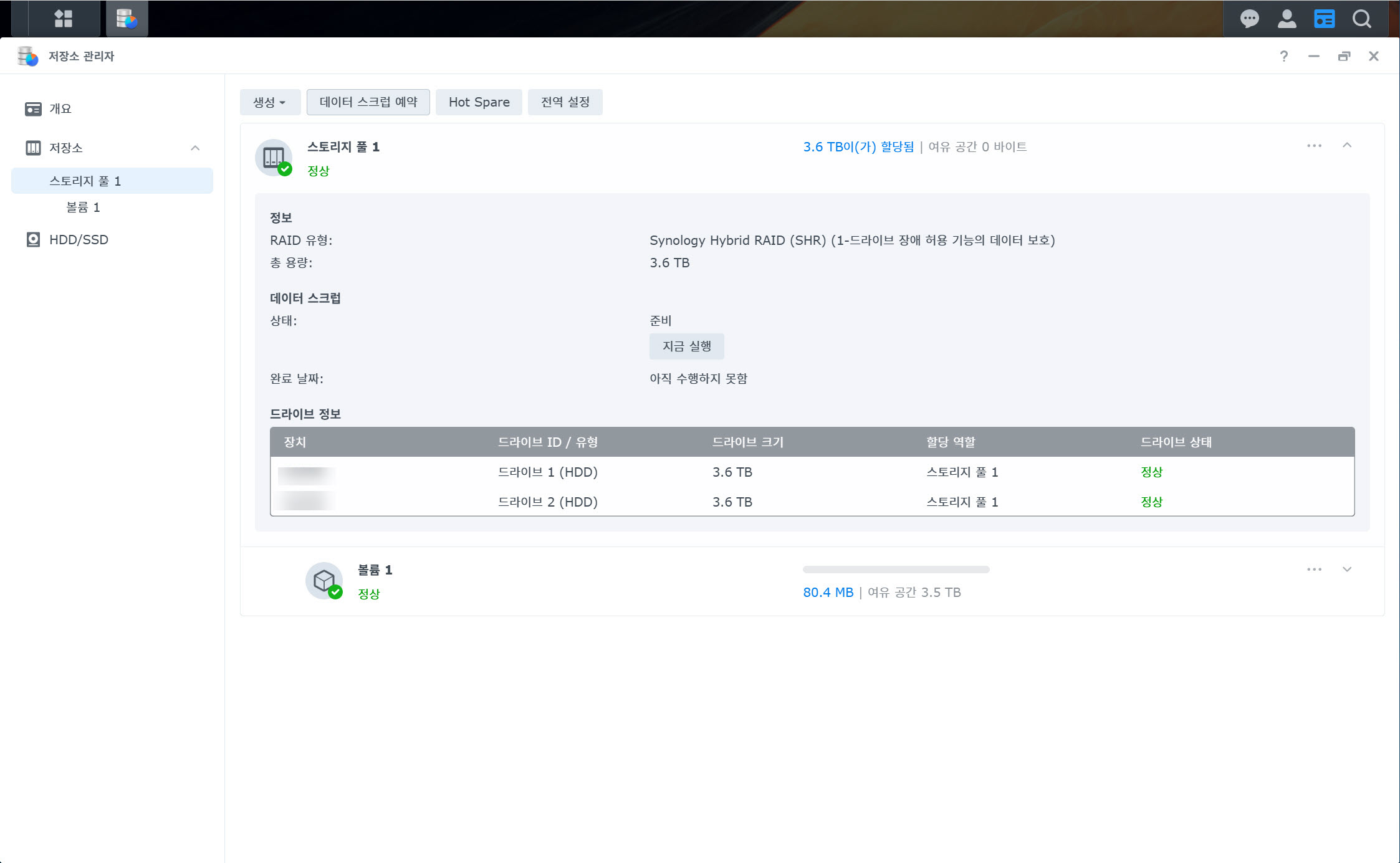 20)나스의 저장소(스토리지, 볼륨, 드라이브) 상태가 모두 정상인것을 확인할수있습니다.