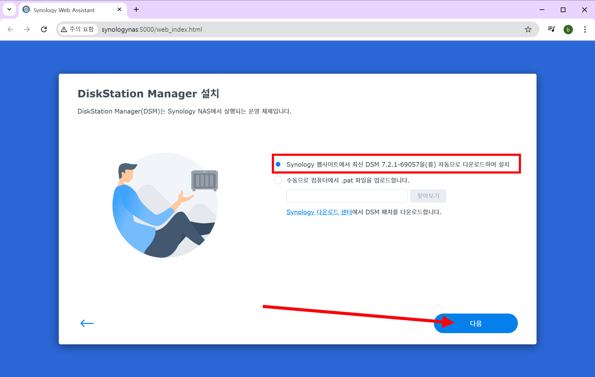 2)Synology 웹사이트에서 최신 DSM을 자동으로 다운로드하여 설치를 선택하고 다음을 클릭합니다.