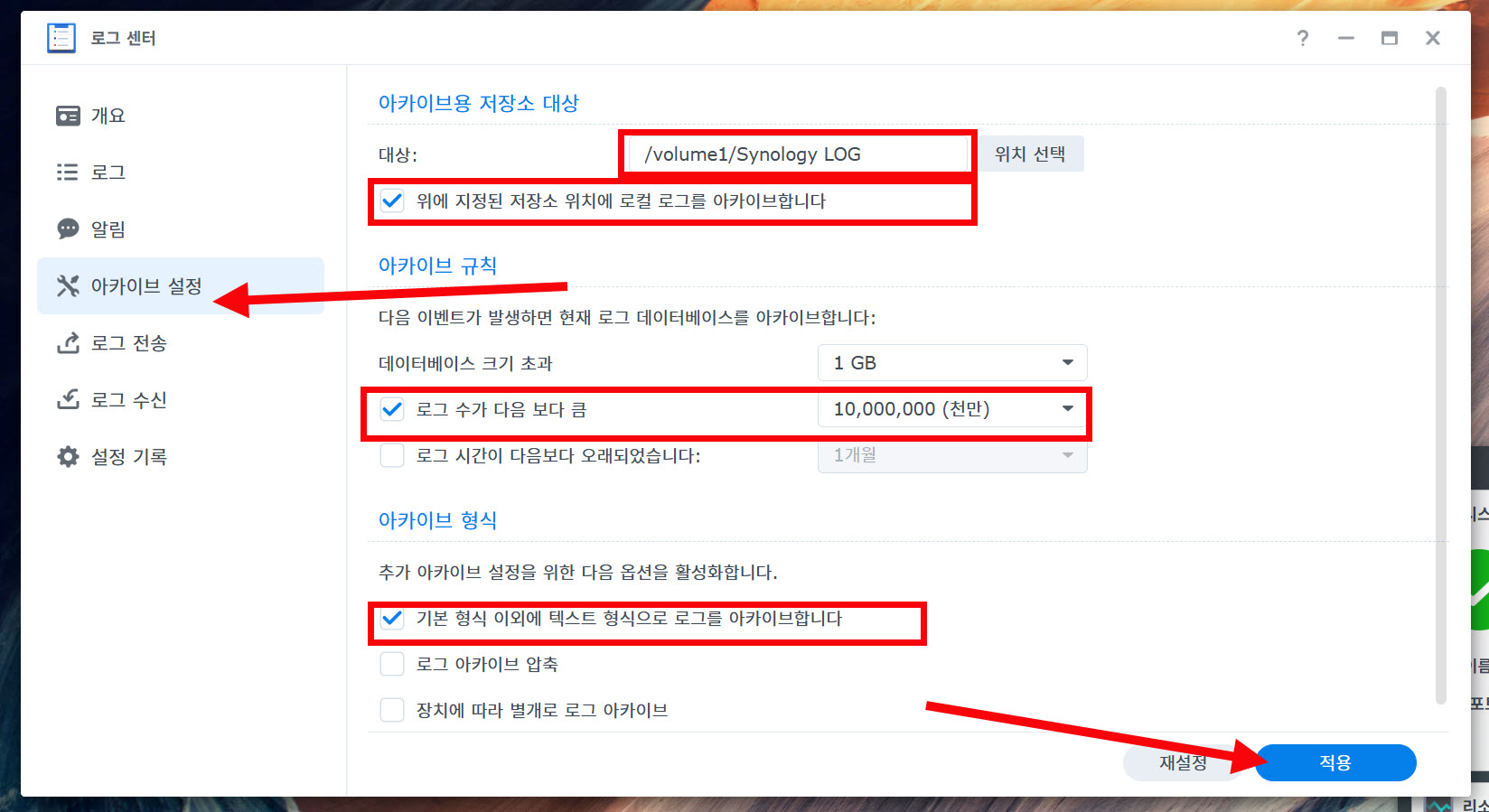 기본 형식 이외에 텍스트 형식으로 로그를 아카이브합니다에 체크합니다.