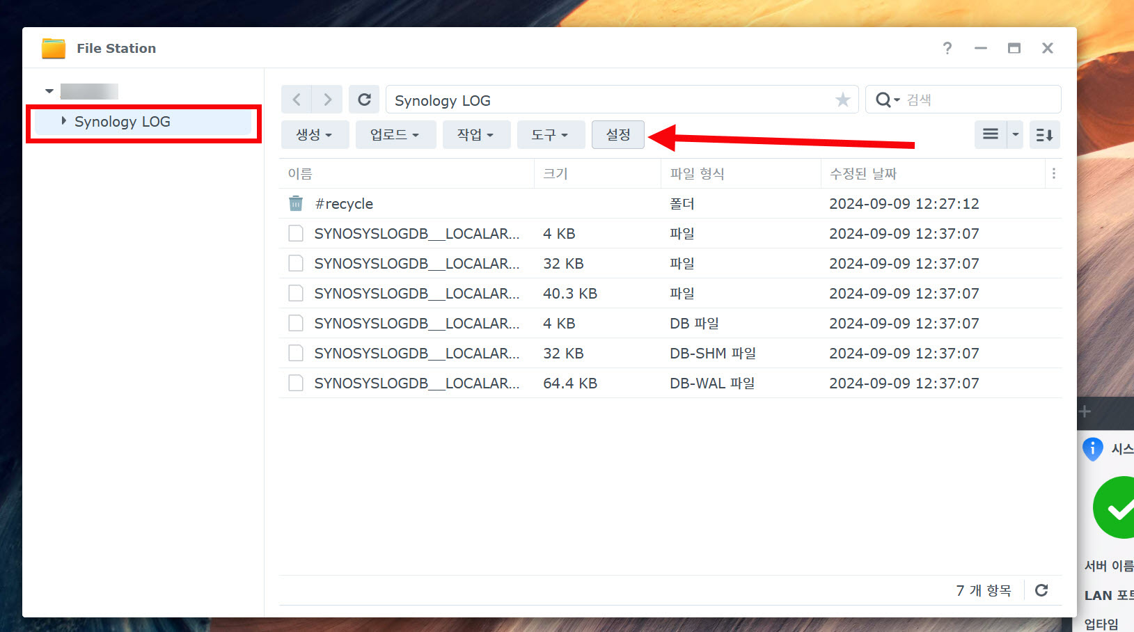 15)파일 시스템(File Station)에서 로그 저장소로 지정한 폴더를 선택하고 설정으로 이동합니다.