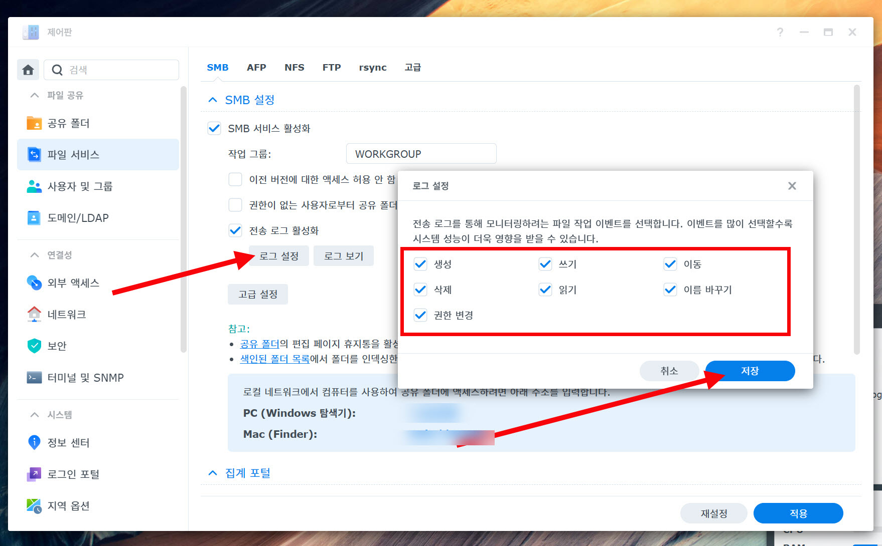 14)제어판의 파일 서비스에서 상단의 SMB를 선택합니다. SMB 설정에서 로그 설정을 선택하고 모니터링 대상 이벤트를 모두 체크하고 저장합니다.