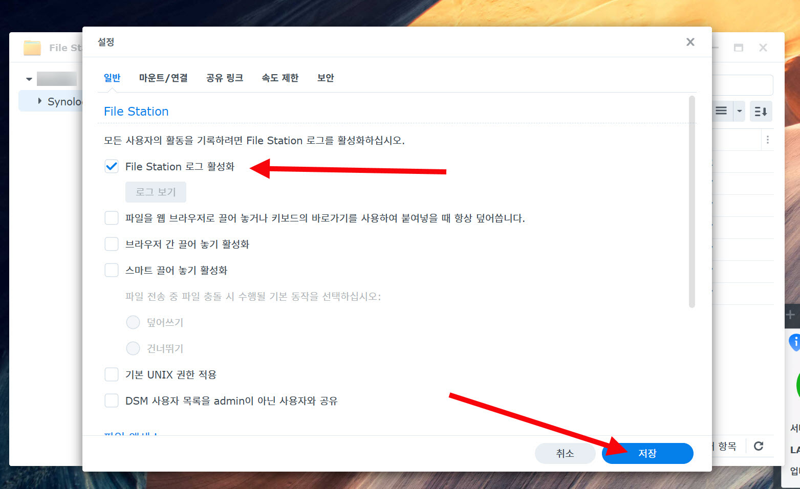16)File Station 로그 활성화에 체크하고 저장합니다.