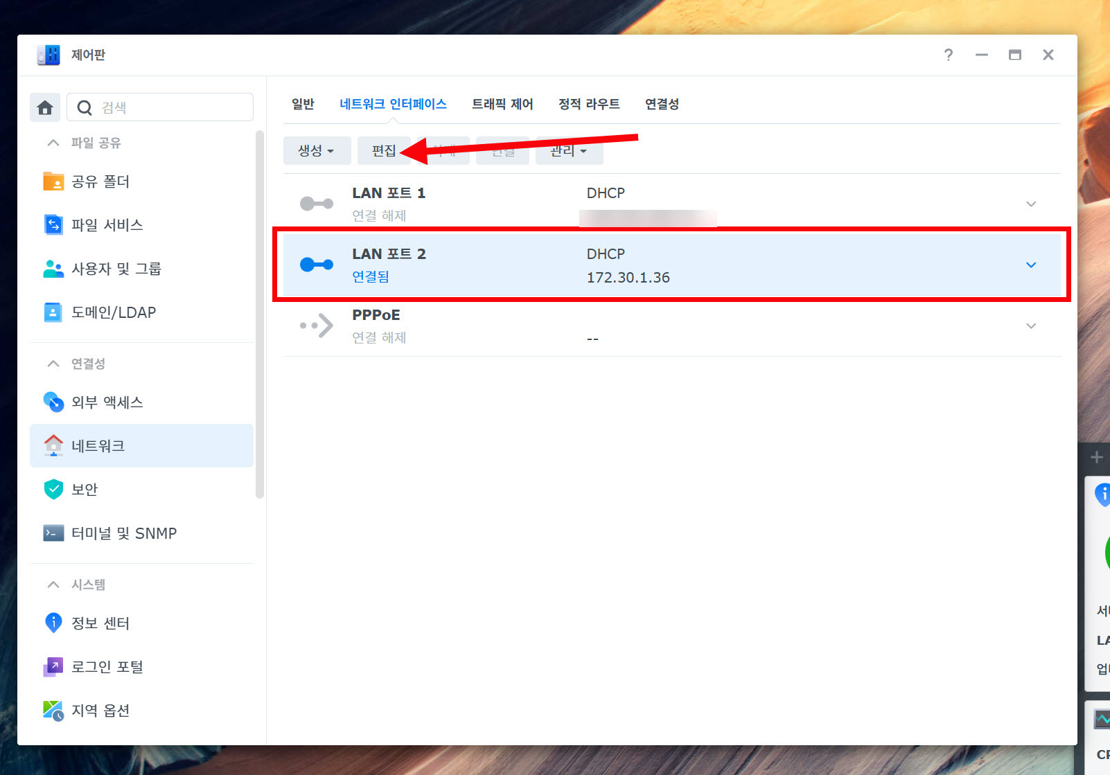 3)현재 연결된 랜(LAN) 포트가 DHCP로 설정되어있는것을 확인할수있습니다. 편집으로 이동합니다.