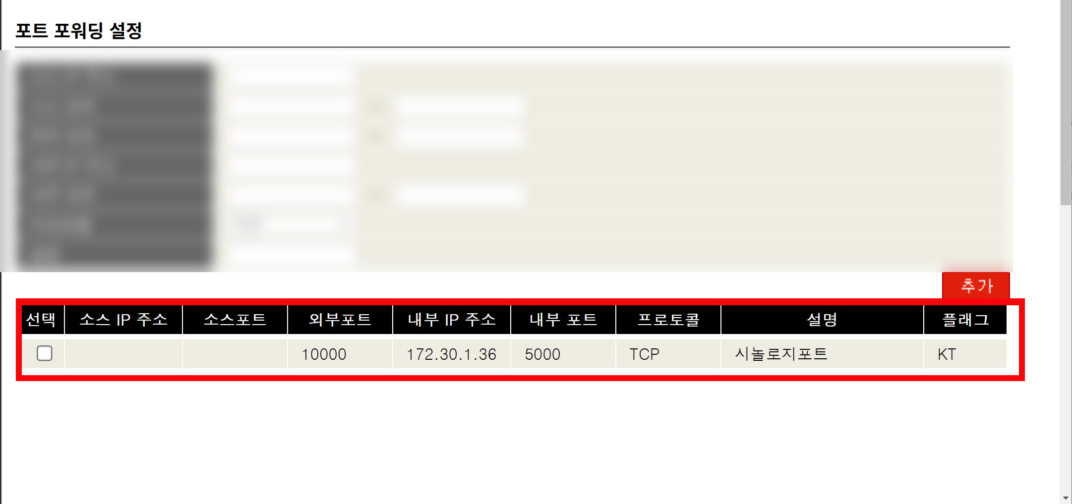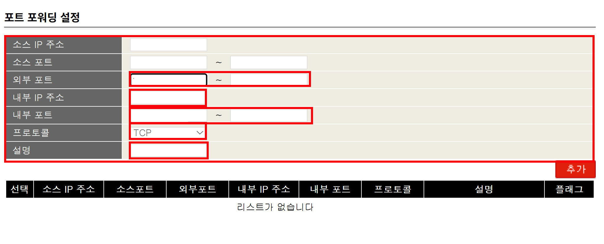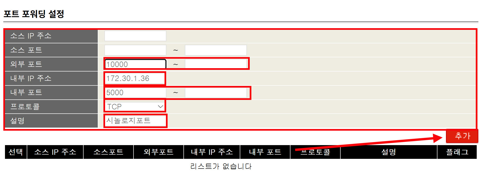7)포트 포워딩 설정을 입력하고 추가하여 완료합니다.