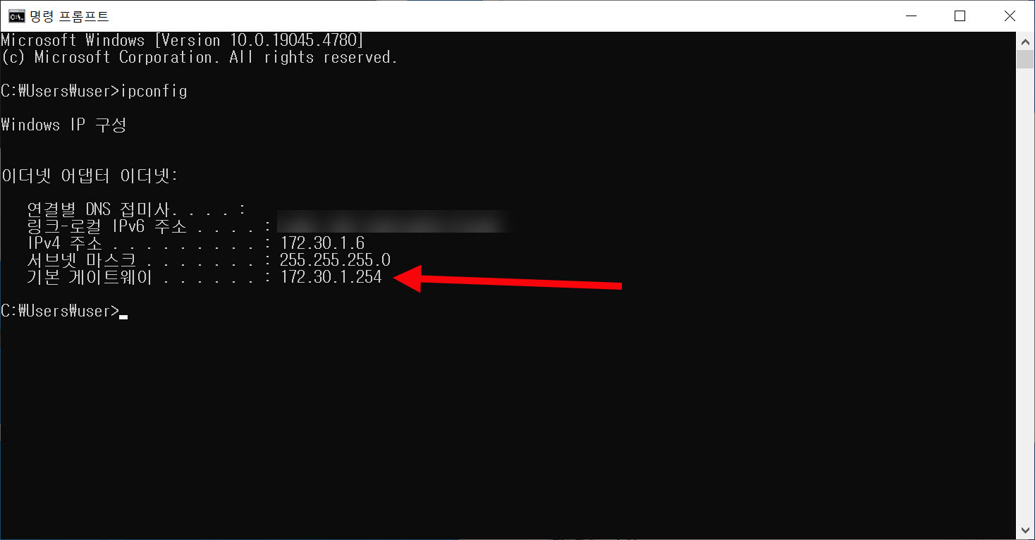 1)명령 프롬프트에서 ipconfig를 입력하고 기본 게이트웨이 주소를 확인합니다.
