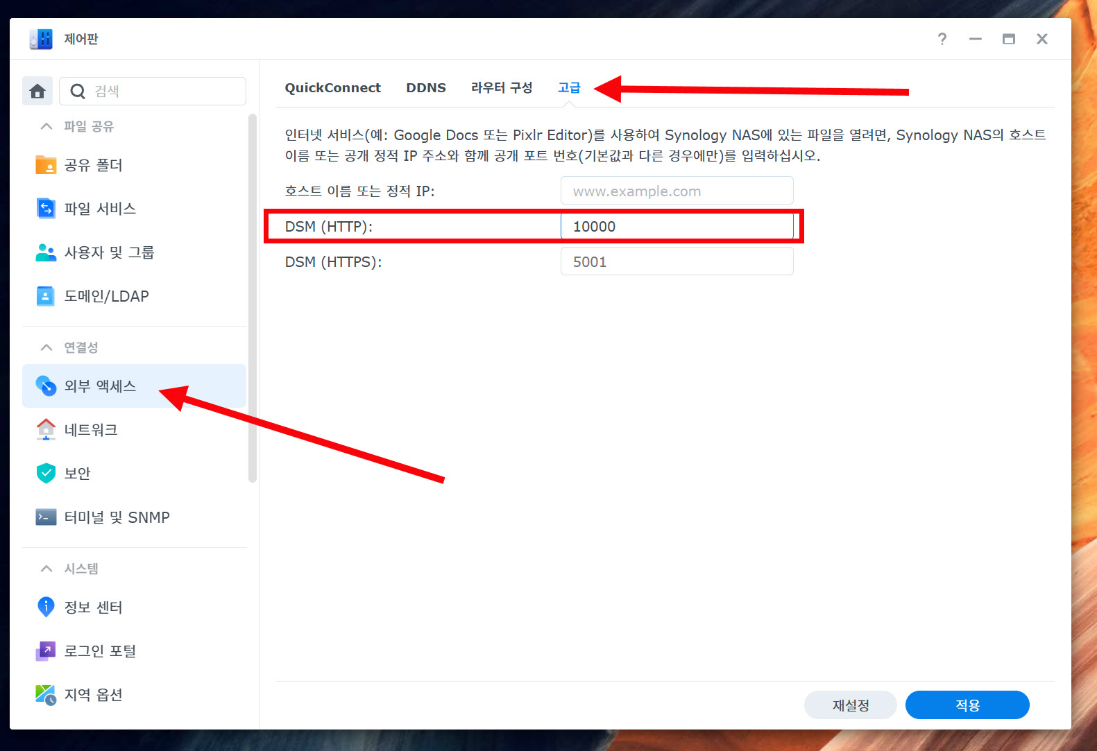 9)외부 엑세스의 고급에서 외부 포트 번호를 변경할수있습니다.