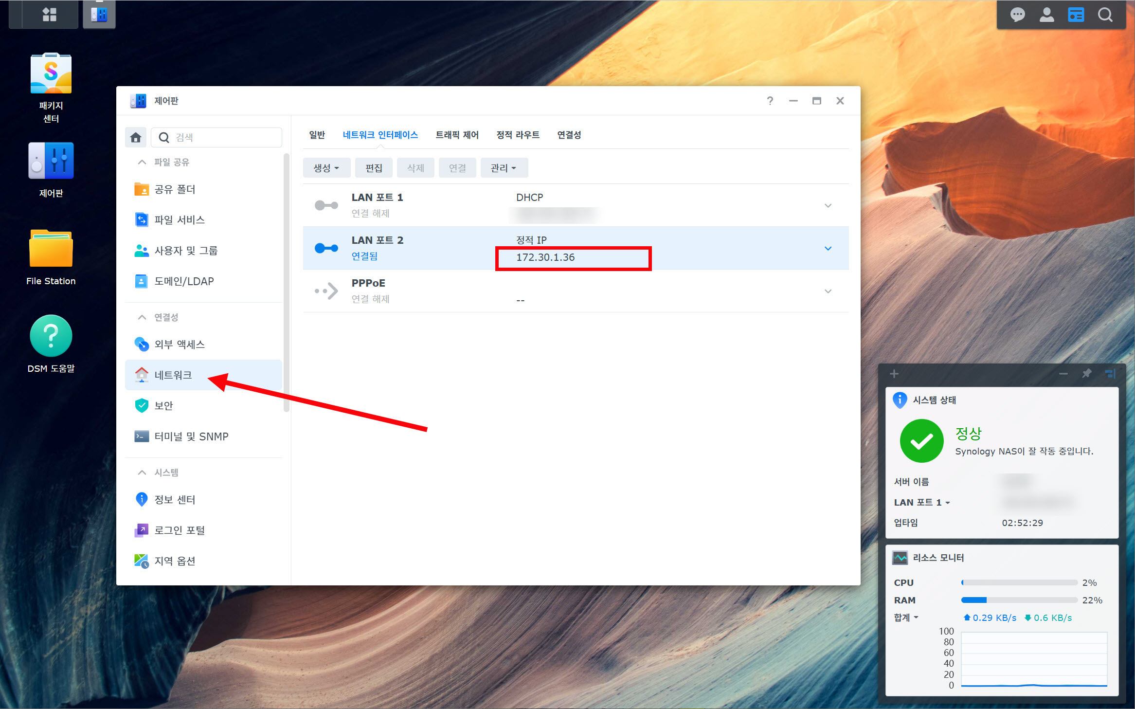 5)제어판의 네트워크에서 NAS의 IP 주소를 확인합니다.