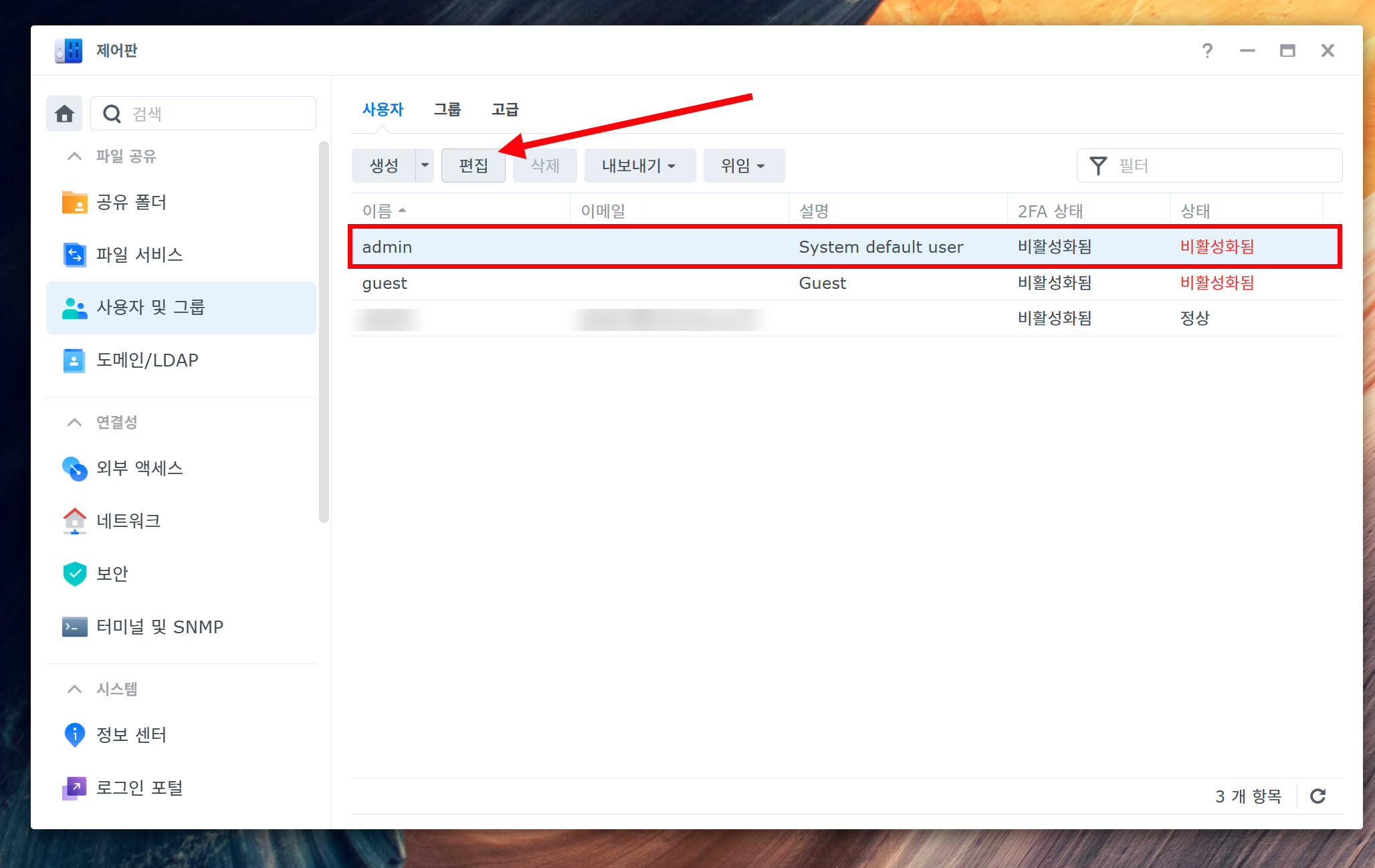 6)사용자 및 그룹에서 admin 사용자를 선택하고 편집으로 이동합니다.