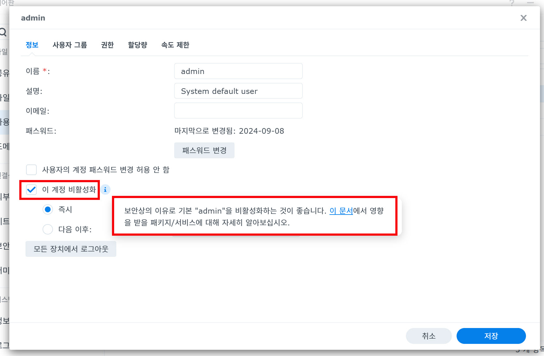 7)이 계정 비활성화에 체크하고 저장합니다. 보안상의 이유로 기본 admin 계정을 비활성화하는것을 권장합니다.