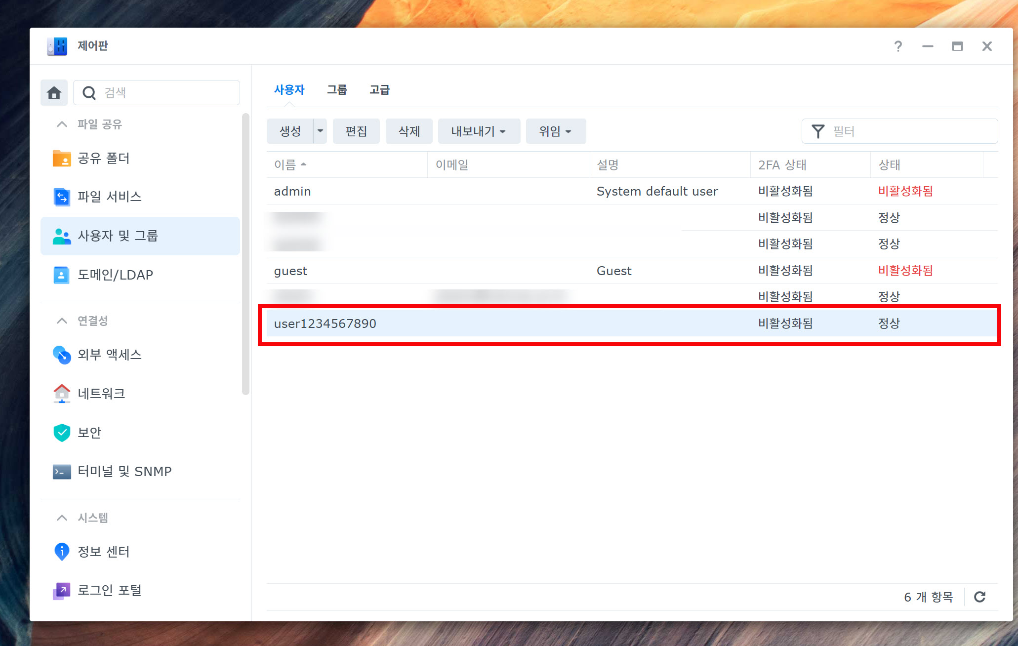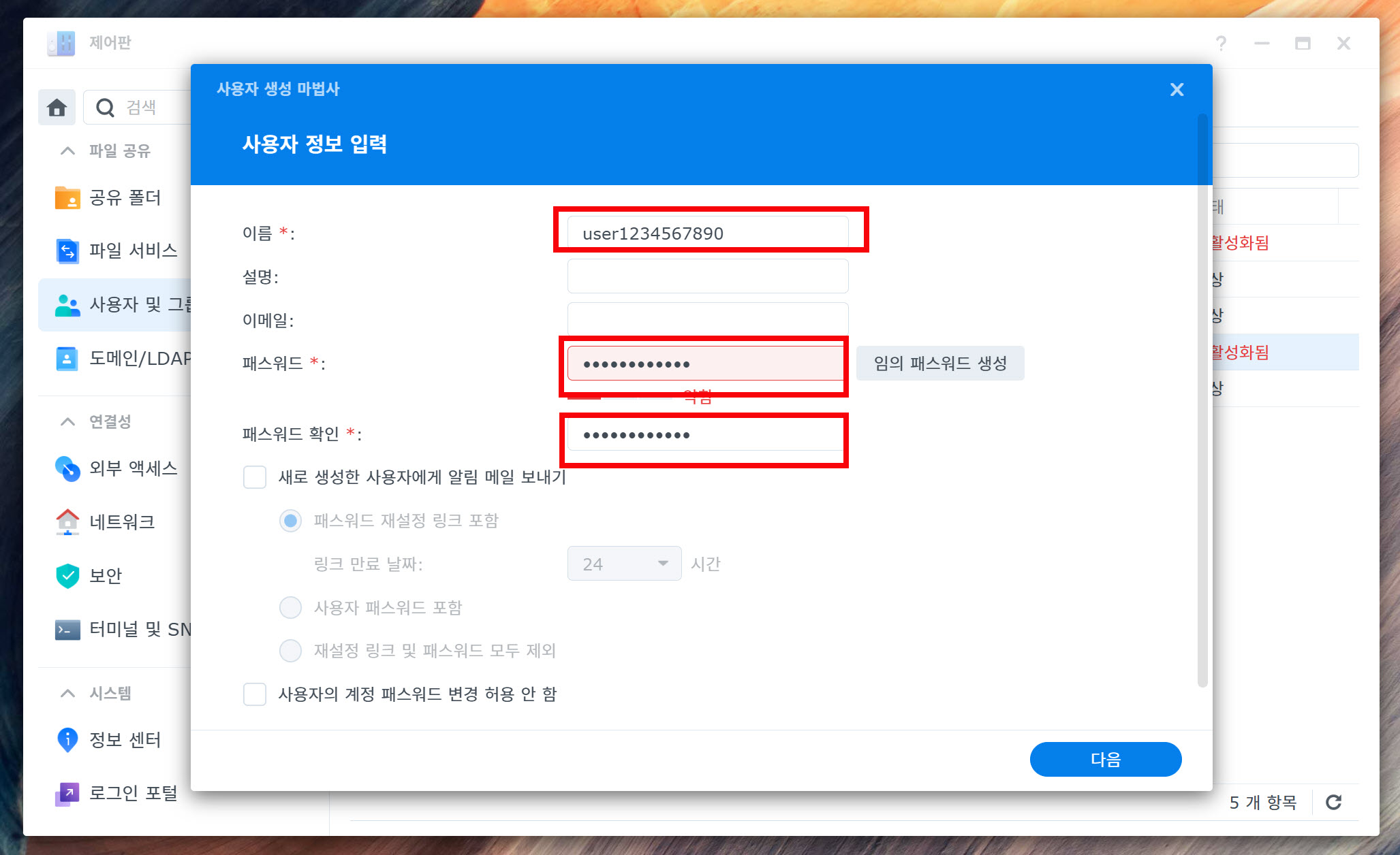 8)NAS에서 새로운 사용자를 생성하고 해당 사용자 이름 (user1234567890) 과 비밀번호를 설정합니다.