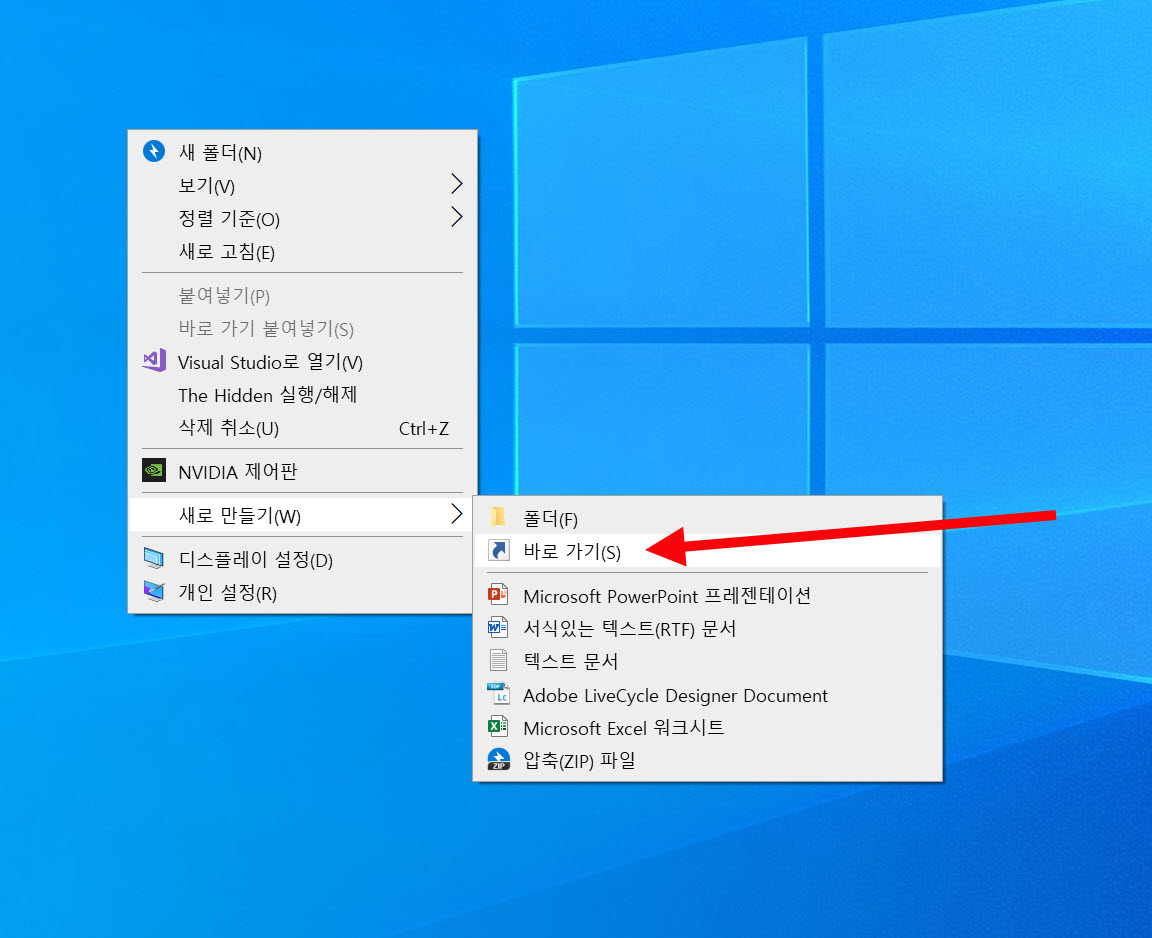 1)바탕화면에서 마우스 우클릭하고 새로 만들기의 바로 가기를 선택합니다.