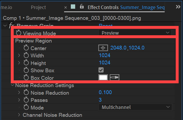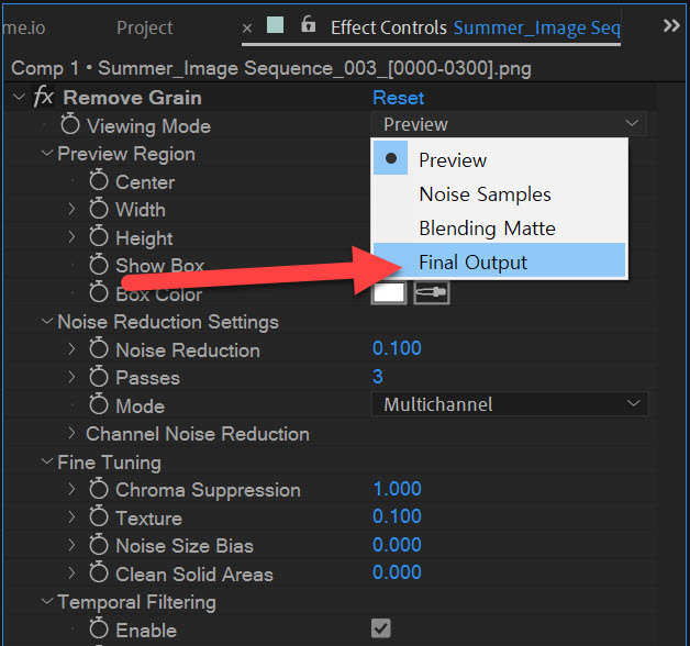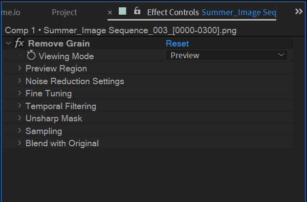 6)Remove Grain의 속성을 설정합니다(Noise Reduction Settings, Temporal Filtering, Sampling, 기타)