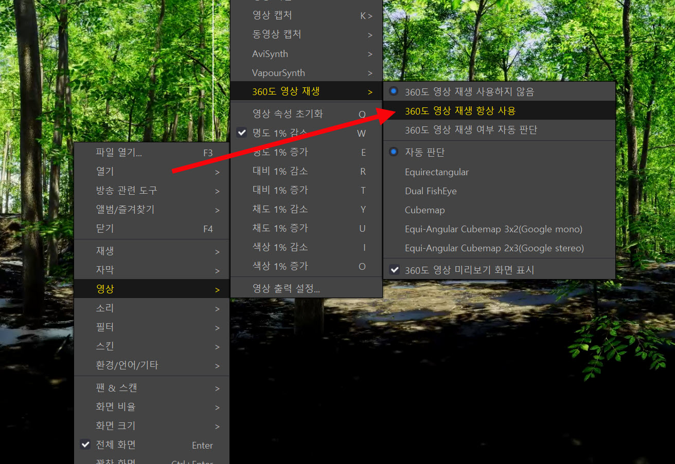 9)동영상을 360 View에서 확인하려면 팟플레이어에서 360도 영상 재생의 360도 영상 재생 항상 사용을 선택합니다.